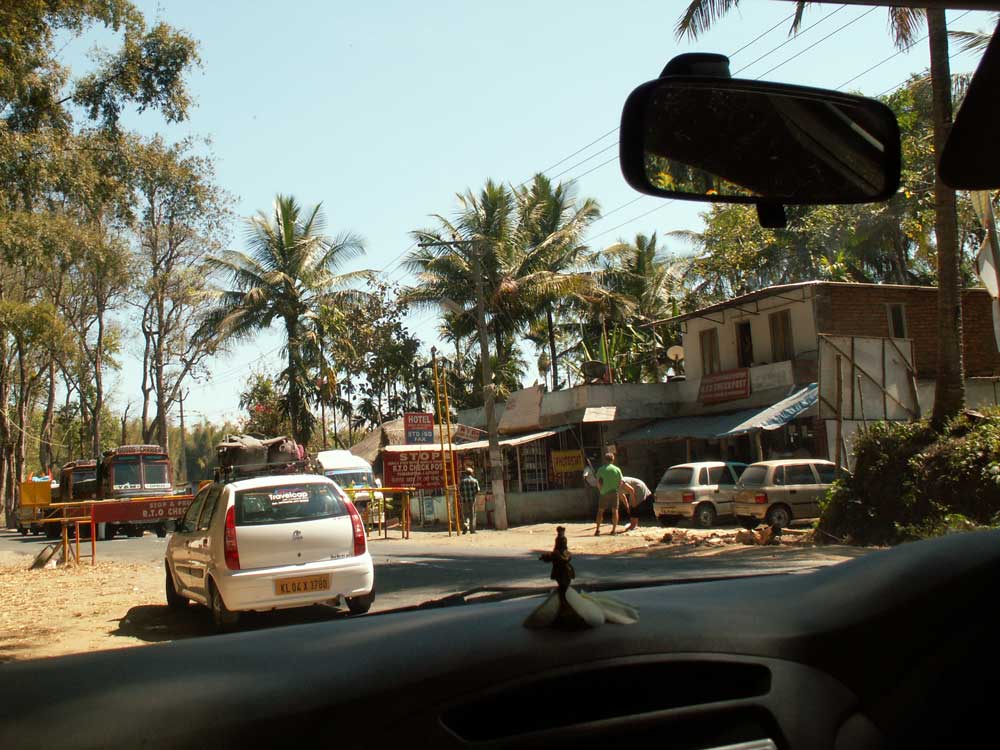 Auf dem Weg von Kerala nach Mysore kamen wir über die Landesgrenze nach Karnataka. Ungefähr 15min Papierkram, da Kfz hier für jeden Bundesstaat ein separates Permit brauchen. Natürlich hat sich unser Fahrer darum gekümmert, solange konnten wir fotografieren... Auf dem Armaturenbrett sieht man die kleine Vishnu-Statue, die unseren Fahrer immer begleitet. Meistens lag auch eine frische Blüte oder ein Blütenkranz dabei.