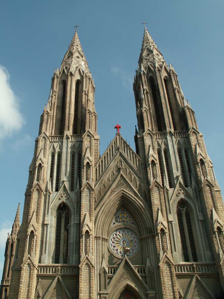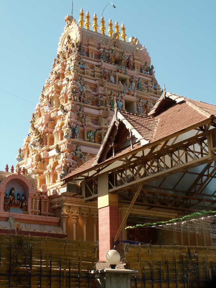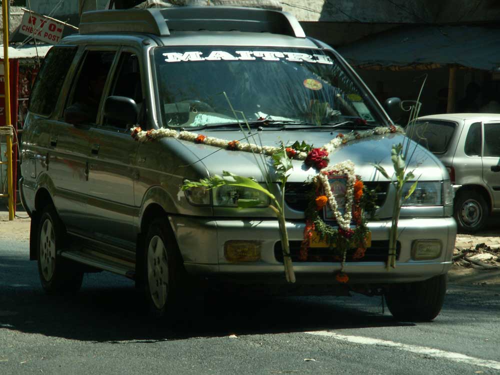 Eins von hunderten Pilgerautos, denen wir auf dieser Fahrt begegnet sind. In einem berühmten Tempel in Kerala stand die jährliche Pilgerreise an. Viele Autos hatten auch noch bunte Fahnen überall. Einige Blumengirlanden fielen übrigens später auf dem Parkplatz hungrigen Kühen zum Opfer -mitsamt Schnur und allem....!