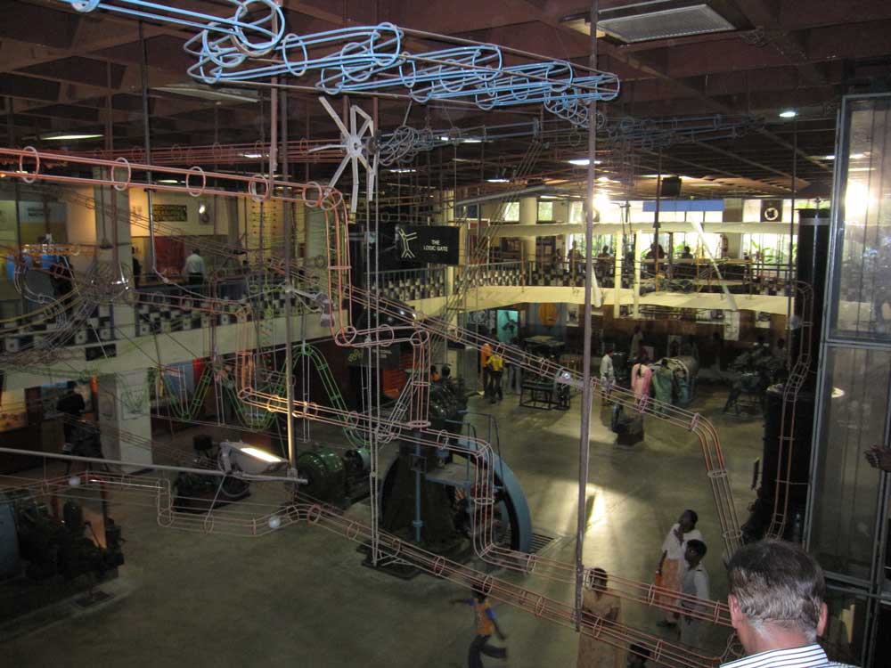 Heute haben wir dem hiesigen Industrie- und Technik-Museum einen Besuch abgestattet. Vier Stockwerke, überwiegend sehr nett gemacht mit jeder Menge Knöpfe um selbst eine Aktion auszulösen oder bestimmte Effekte zu beobachten. Für die indischen Schulklassen sind natürlich auch wir „Westler“ wieder Teil der Attraktion. Die werden da im Schnelldurchgang durchgeschleust und erklärt wird ihnen nix – ein paarmal können wir jemandem zeigen, wie das betreffende Experiment eigentlich funktioniert… Klimaanlage ist Fehlanzeige, so sind wir nach 2 Stunden ziemlich durchgeschwitzt und halb verdurstet.