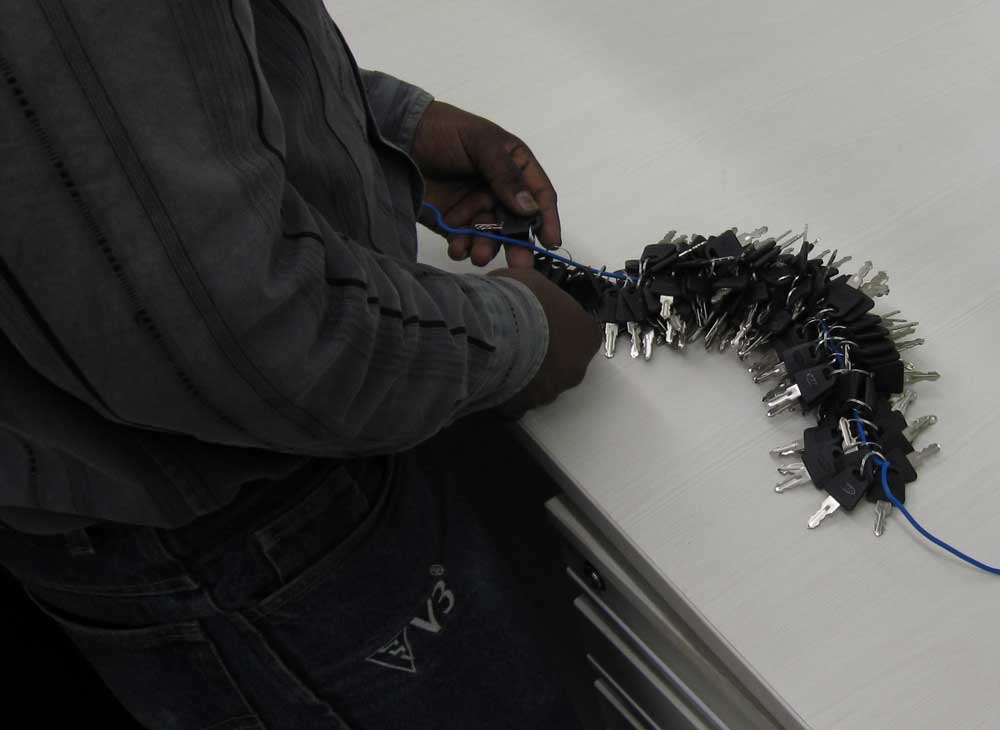 Am Samstag hatten wir die Truppe irgendwann soweit, dass sie zuerst die Lampen abstaubten (da rieselt ja alles auf die Tische) und danach die Tische putzten. In Indien muss man beim Erstbezug alle Tischplatten und Regalbretter unbedingt auch von unten putzen, da die irgendwo staubig gelagert werden und bei der Montage niemand einen Lappen in die Hand nimmt. Dann mussten wir ihnen beibringen, dass ein Lappen zwischendurch in Wasser ausgewaschen werden muss und man am besten die Platte zuletzt noch mit einem trockenen Lappen abreibt. Wir sind dann immer wieder durch die Reihen gelaufen und haben „frisches Wasser holen“ verlangt, wenn es schon wieder eine schwarze Brühe war…. und wenn man nicht scharf hingeguckt hat, saßen die Mädels unter dem Tisch und haben geratscht, und die Jungs saßen unter dem Tisch und haben mobiltelefoniert.
