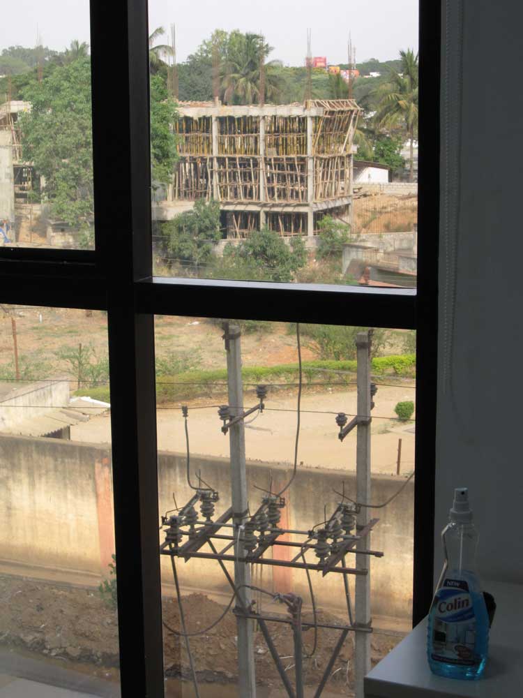 Naja, jedenfalls haben wir am Sonntag dann erst viel später kontrolliert, auch weil überall jemand rumgeputzt hat und wir gar nicht sehen konnten, welche Ecke jetzt schon fertig sein könnte. Mit verheerendem Ergebnis. Das war dann nachmittags um 3 oder so. Wir haben deren Chef klargemacht, wo überall nachgebessert werden muss, und jede zwei Putzern nochmal haarklein erklärt und gezeigt, wie wir es haben wollen. Die haben dann unter unserer Aufsicht reihenweise nachgeputzt. Dann haben wir uns erstmal Mittagessen gegönnt…. um 5 wollten die dann Feierabend machen und vorne waren ein paar Arbeitsplätze, die schon belegt waren, überhaupt nicht angefasst. Da hat’s uns dann gelangt – Marcus‘ Chef (mit dem Ehrgeiz, das sauberste Bürogebäude in Bangalore zu haben) hat die großen Glasschilder geputzt, Marcus die Scheiben an den Eingängen und Chefs Frau und ich haben wenigstens die ab Montag belegten Tische mal grob saubergemacht. Das war dann den indischen Kollegen wiederum so oberpeinlich, dass endlich mal Bewegung in die Sache kam. Die Putzkolonne wurde für Montag früh 6 Uhr bestellt (das ist hier lange vor dem Aufstehen!) und wir haben’s dann auch nach ein paar Tischen gut sein lassen.