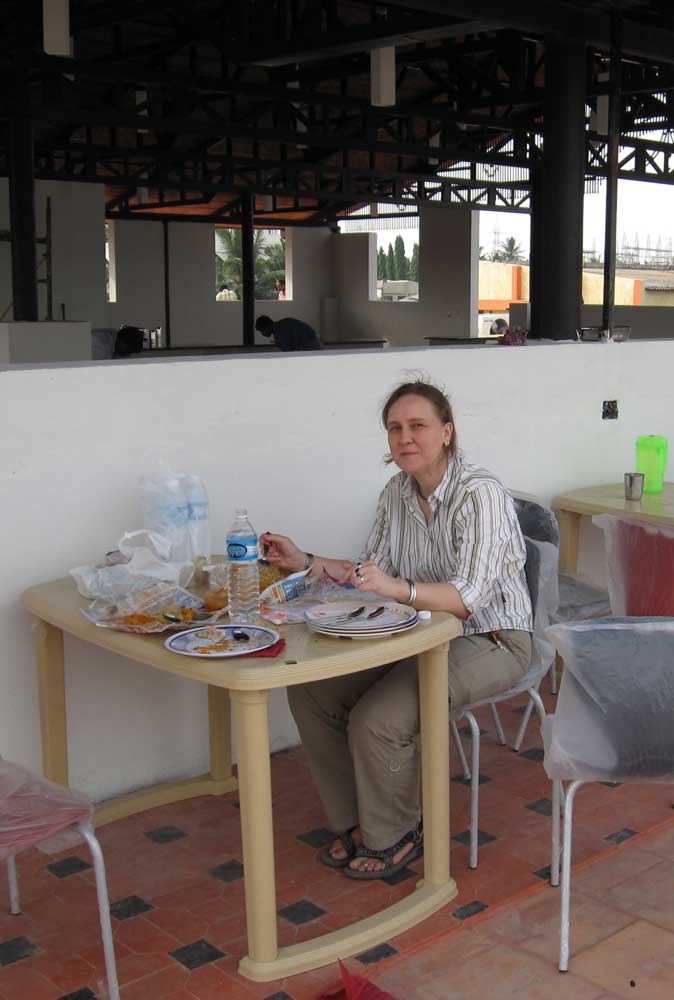 Das war dann allerdings auch unsere Wochenendbeschäftigung: Samstag und Sonntag haben wir komplett im neuen Büro verbracht, um die Putzkolonne zu beaufsichtigen. Die übrigen Expat-Ehefrauen waren auch da. Indische Putzkolonne, ich kann euch sagen! Wenn man denen nicht genau auf die Finger schaut, putzen sie mit dem selben Lappen zuerst das Klo, dann die Stuhlbeine und zum Schluss die Tischplatten. Und am liebsten schrubben sie mit dem Scheuerschwamm auf den Platten herum. Die Scheuerlappen mussten wir zuallererst konfiszieren (für die Flecken auf den Kalksteinböden brauchten sie die leider später wieder, was noch ein paar Tischplattenoberflächen kostete).