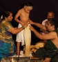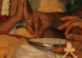 Auch dies ist ein sehr wichtiger Teil der Zeremonie: Verborgen unter einem Seidentuch, flüstert sein Vater Nikhil geheime Brahmanentexte ins Ohr. Diese werden nur vom Vater zum Sohn weitergegeben.