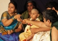 Vor der Kopfrasur darf Nikhil zum letzten Mal vom Teller seiner Mutter essen. Sie füttert ihn mit allen möglichen Leckereien (entsprechend zufrieden sieht er auch aus). Ab jetzt darf er nur noch von seinem eigenen Teller essen. Hinter ihm steht sein Vater.