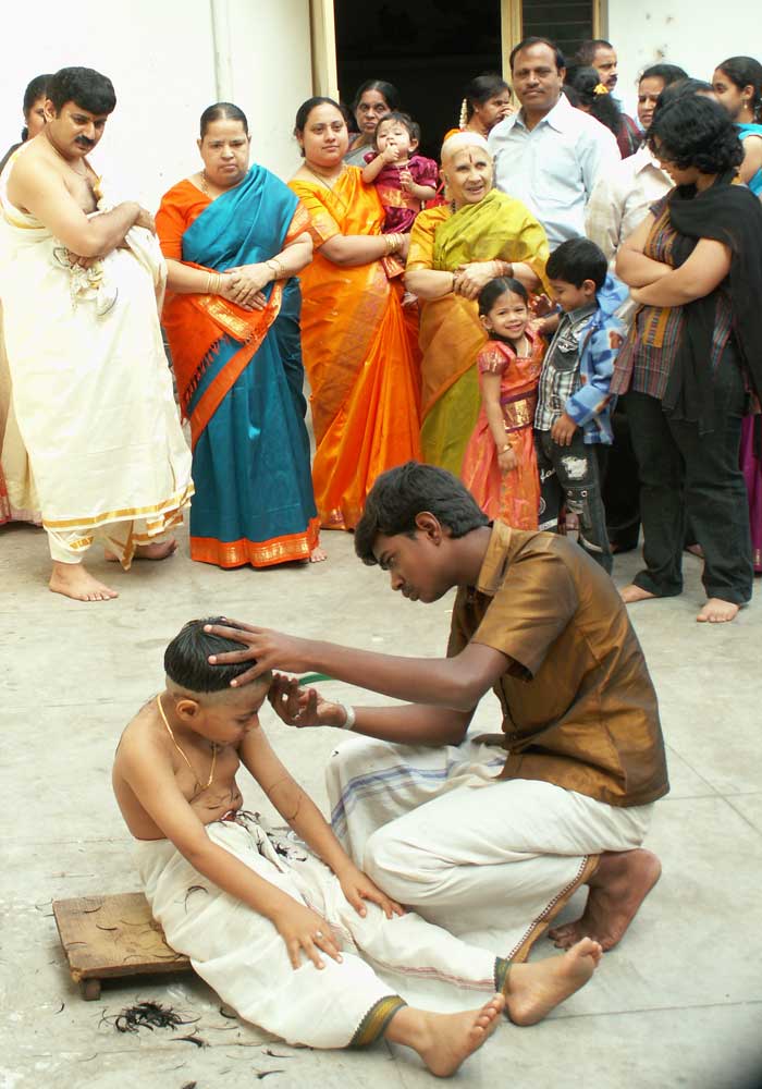 Der 8jährige Nikhil ist seit 3 Uhr nachts auf den Beinen, da die zentrale Zeremonie für 9:30 bis 10:30 angesetzt wurde (die passende Zeit legt ein Astrologe fest, das passiert auch bei Hochzeiten und allen anderen wichtigen religiösen Zeremonien) und vorher noch diverse andere Rituale vorgenommen werden müssen. Wir kommen gerade rechtzeitig an, um der Kopfrasur beizuwohnen. Dabei wird der Kopf geschoren, als Zeichen dafür, dass keinerlei Eitelkeit um die Frisur