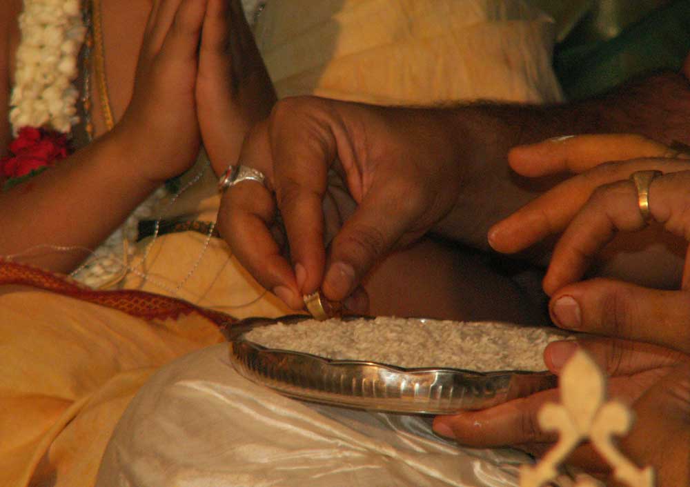 Nikhils Vater schreibt mit seinem Ring heilige Texte in Reis.