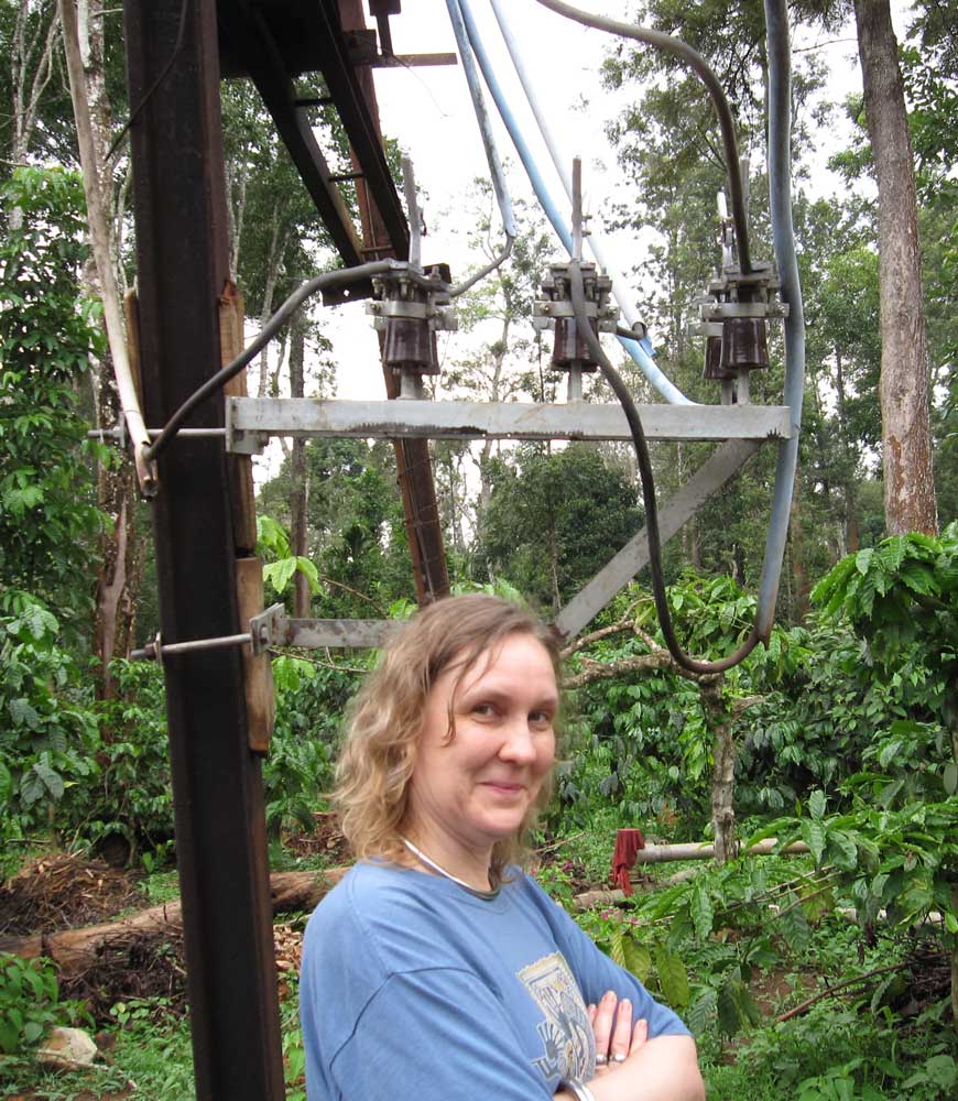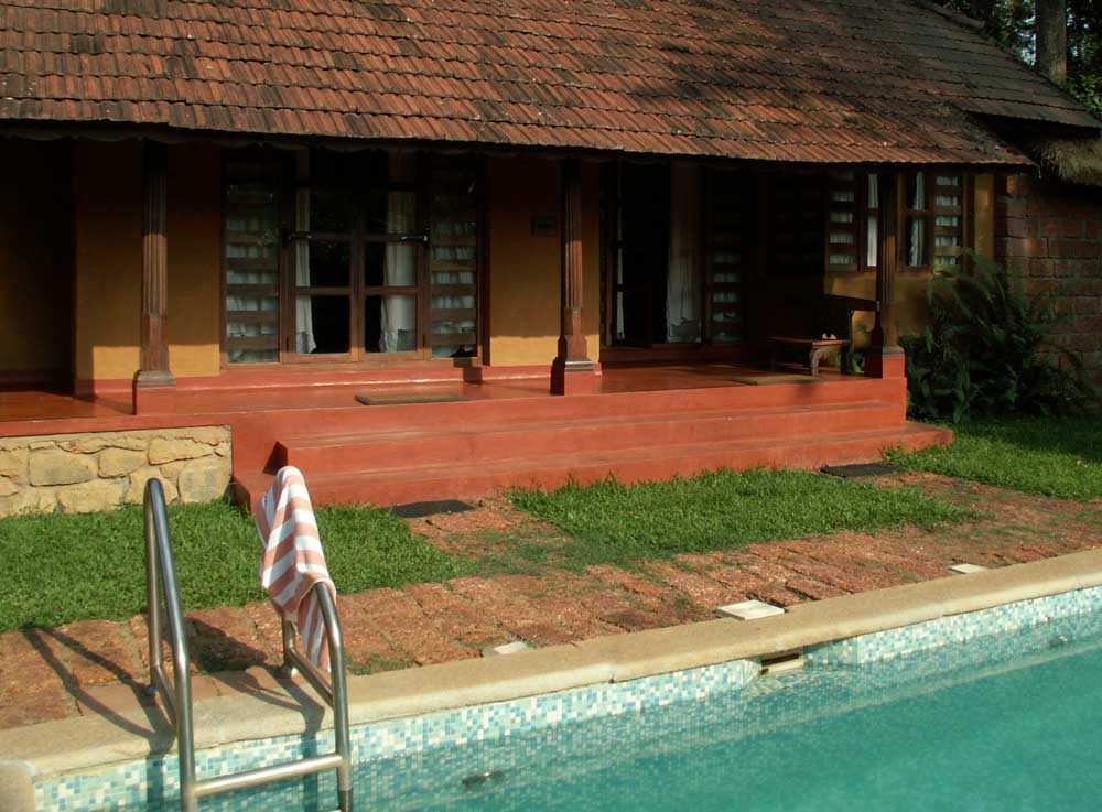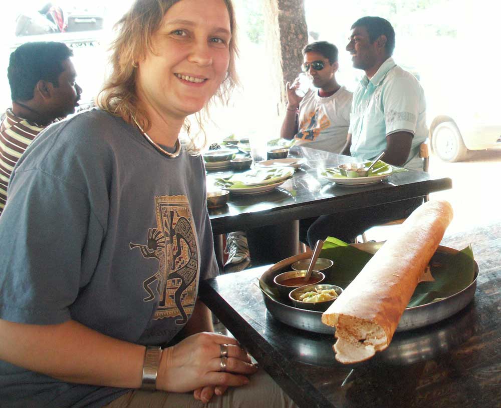 Abfahrt Samstagmorgen 8:15 (fast pünktlich). Zweites Frühstück auf halbem Weg in einer Art indischen Autobahnraststätte. Unser Fahrer Raj lässt sich sogar zuerst mit an unseren Tisch bitten (er flüchtet dann doch noch an den Nachbartisch), lässt sich aber zu einem Masala Dosa und dann noch Puri einladen. Martina probiert „Paper Dosa“: ein Dosa, halb so dünn und doppelt so groß wie ein normales, schön knusprig, allerdings aufwendig zu essen! Nach einem Kaffee geht es weiter und um halb drei (nach 4 Stunden reiner Fahrzeit) sind wir im Resort mitten in einer Kaffeeplantage, ungefähr 240km von Bangalore entfernt. Unser Fahrer bedankt sich bei Gott, dass der uns gut hergebracht hat, und wir bedanken uns beim Fahrer, dass er so gut gefahren ist – Gott brauchte ja schließlich ein passendes Werkzeug auf Erden.
