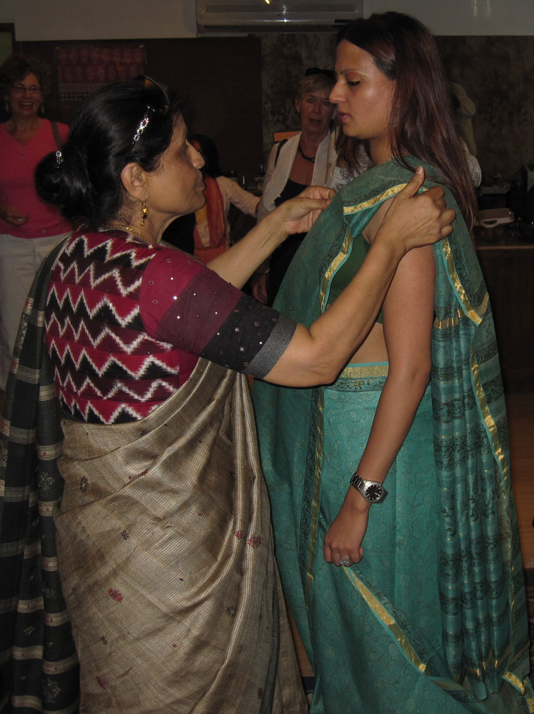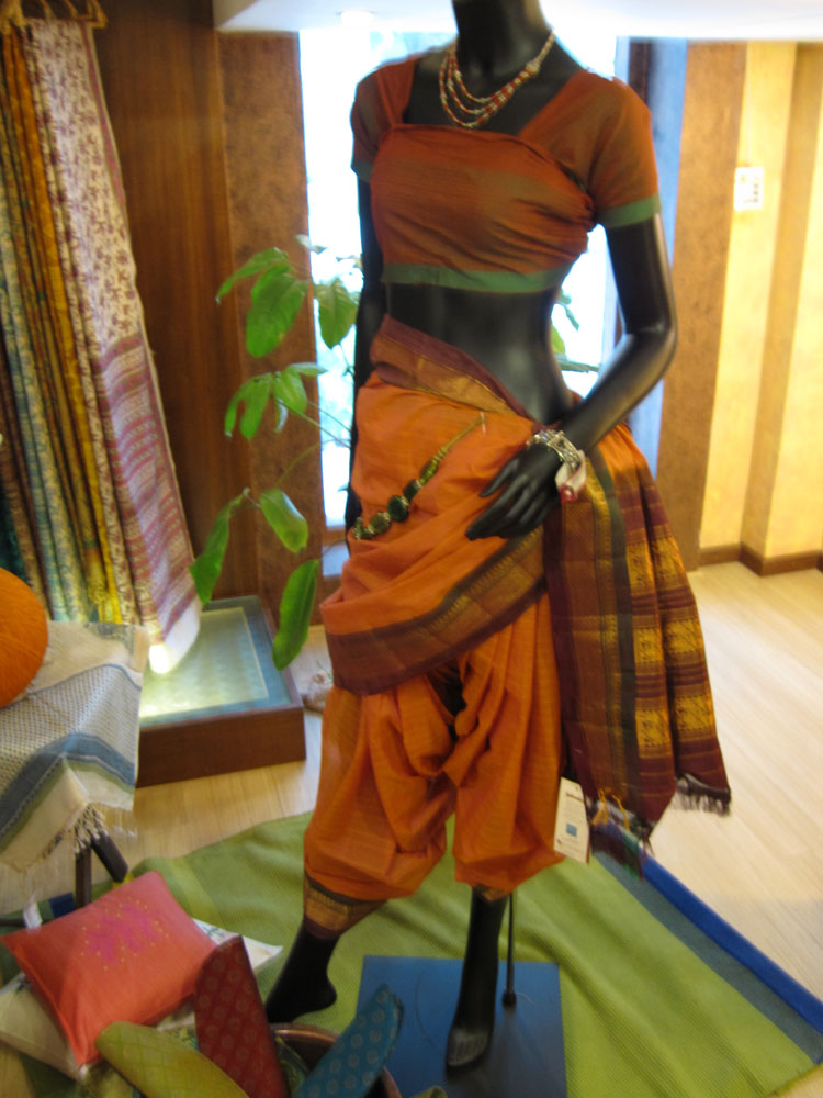 Ein auf indische Handwebstoffe spezialisierter Laden veranstaltet eine Sari-Wickel-Präsentation und eine Freundin und ich schauen uns das mal an – in der Hoffnung, anschließend unseren Sari selbst wickeln zu können. Weit gefehlt, es geht keineswegs um einen gewöhnlichen Alltags-Sari, sondern sie zeigen ziemlich spezielle Wickeltechniken für Tänzerinnen (der Sari als Hose) sowie aus Coorg und Tamil Nadu. Egal, hübsche Stoffe, attraktive Models, ein sehr gutaussehender Verkäufer (der eindeutig nicht dem weiblichen Geschlecht zugewandt ist) und diverse OWC-Kolleginnen. Wir bekommen natürlich auch Kaffee und Snacks und fotografieren die SD-Karten voll.