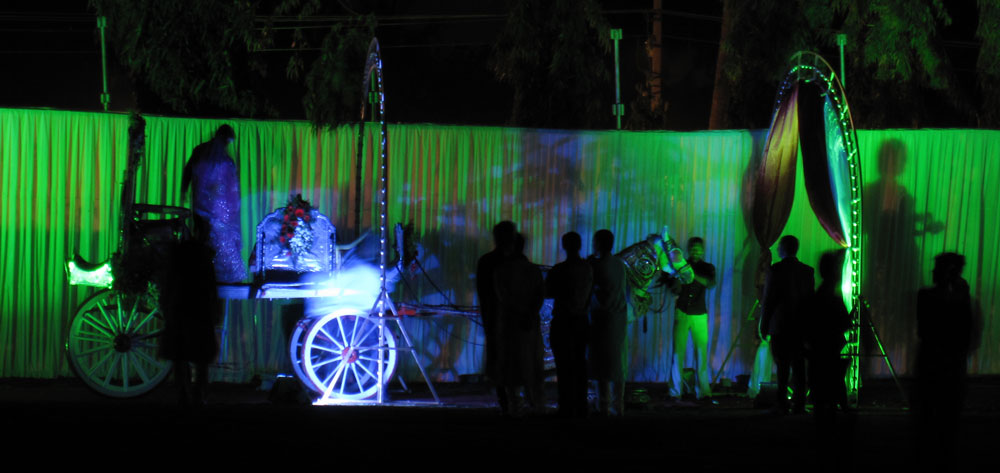 Unsere Samstagabende verbringen wir oft mit lecker essen gehen. Das ist echt super hier in Bangalore! Anfang Februar waren wir mit einer befreundeten Familie indisch essen, und in dem Hotel fand zeitgleich eine Hochzeit statt. Die Musik war entsprechend laut, aber ganz gut und wir konnten zahlreiche sehr hübsch angezogenen Damen im besten Sari und festlich angezogene Herren in Kurta (knielanges Hemd) bewundern. Noch bevor unsere Vorspeisen serviert werden, wird in der Nähe unseres Tischs eine Art Hochzeitskutsche vorbereitet. Erst auf den Fotos habe ich gesehen, dass da gerade das Brautpaar auf die Kutsche gestiegen ist! Es war halt ziemlich dunkel und ich hab einfach mal draufgehalten und ein paar Fotos gemacht, weil das Licht so toll aussah.