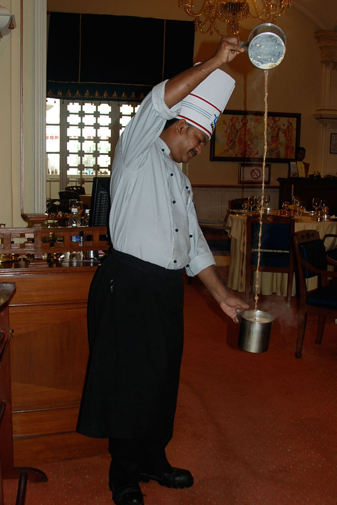 The meal ended with a hot cup of freshly brewed Kafi. Before serving the coffee, the chef showed us the traditional way to mix and cool the Kafi to a sipping temperature. He demonstrated by pouring the milky coffee back and forth between two stainless steel containers, in huge arc-like motions of the hand. It was then served to each of us in a traditional stainless steel dabarah and tumbler.“