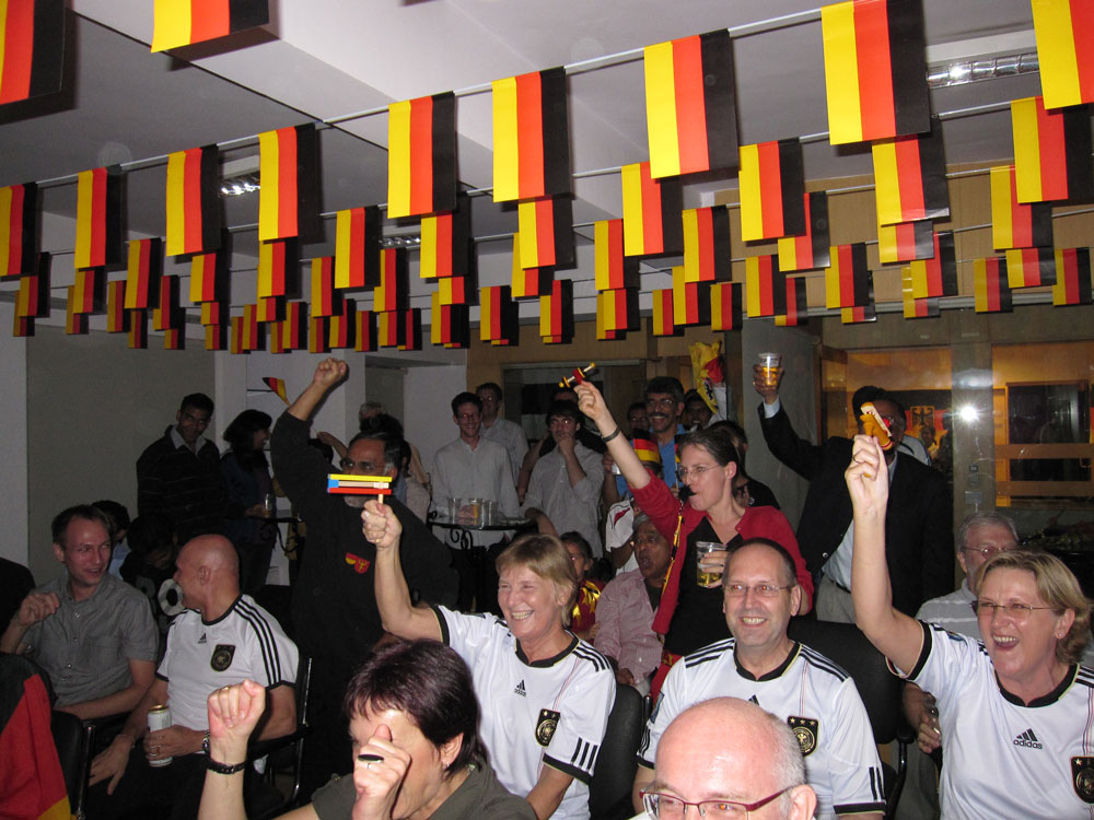 Dann kurz heim, umziehen und wieder los zum Weltmeisterschafts-Fußballspiel Deutschland gegen Argentinien in der Handelskammer (siehe 27.06.2010). Die Stimmung ist diesmal natürlich noch viel besser, nach dem ersten schnellen Tor. Sponsoren gab es diesmal keine, aber für wenig Geld gibt es wieder deutsche Spezialitäten, und Bier sogar vom Fass. Zapfen braucht allerdings deutsche Unterstützung, zum Glück hat Marcus das ja drauf. Ein tolles Fußballfest! Leider eignen sich die kleinen Papierfähnchen nicht wirklich für einen Autocorso, und die Zuschauer verstreuen sich auch zu schnell in alle Richtungen. Aber wir jubeln quasi die ganze Heimfahrt lang. Wer’s verpasst hat: