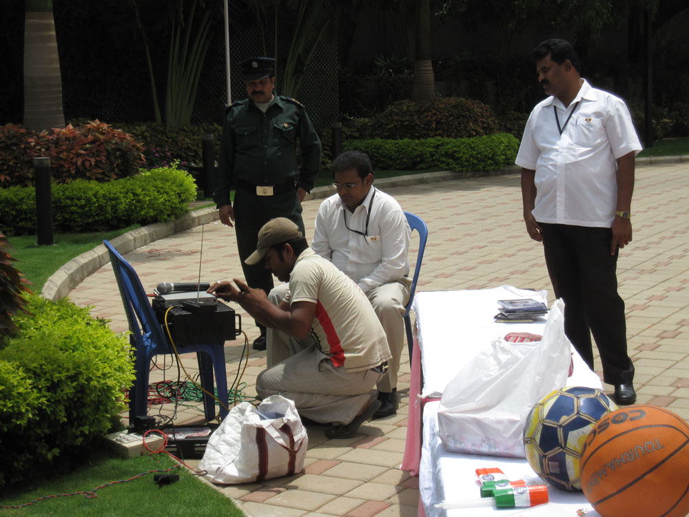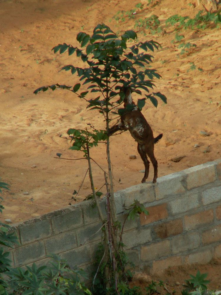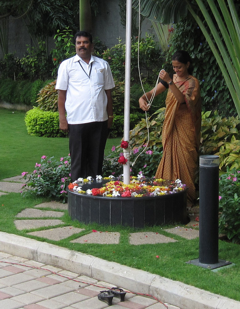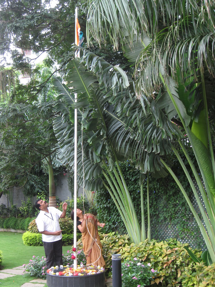 Morgens um 9 war mal wieder Staatsfeiertags-Fahnenappell. Es waren recht viele Bewohner da und natürlich alle Hausangestellten. Wir hatten vorher im Haus gesammelt und jeder vom Personal erhielt ein Kleidergeschenk (die Frauen einen Sari, die Männer Hemd+Hose). Auf diese Weise erfuhren wir wenigstens auch mal die Namen der Angestellten! Es war sogar noch Geld übrig für eine bebilderte englische Taschenbuch-Enzyklopädie für jedes Angestellten-Kind, die haben sie alle an ihre Brust gedrückt wie einen Schatz!