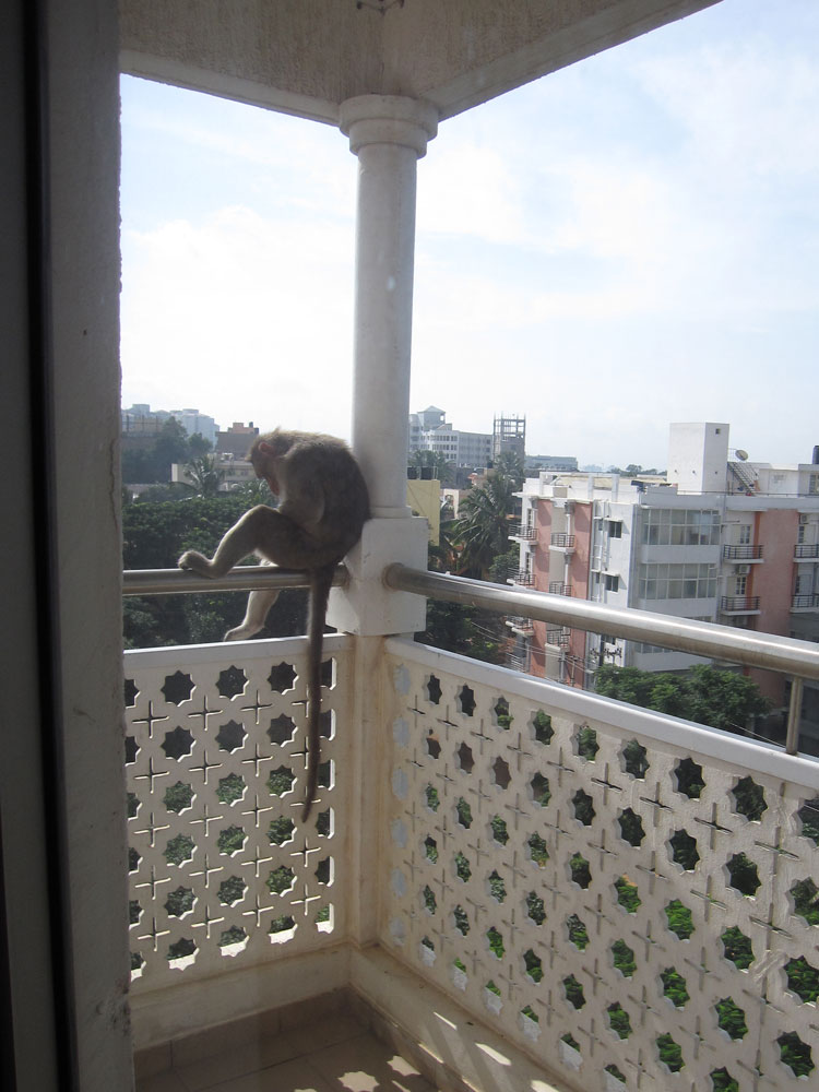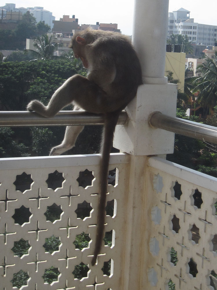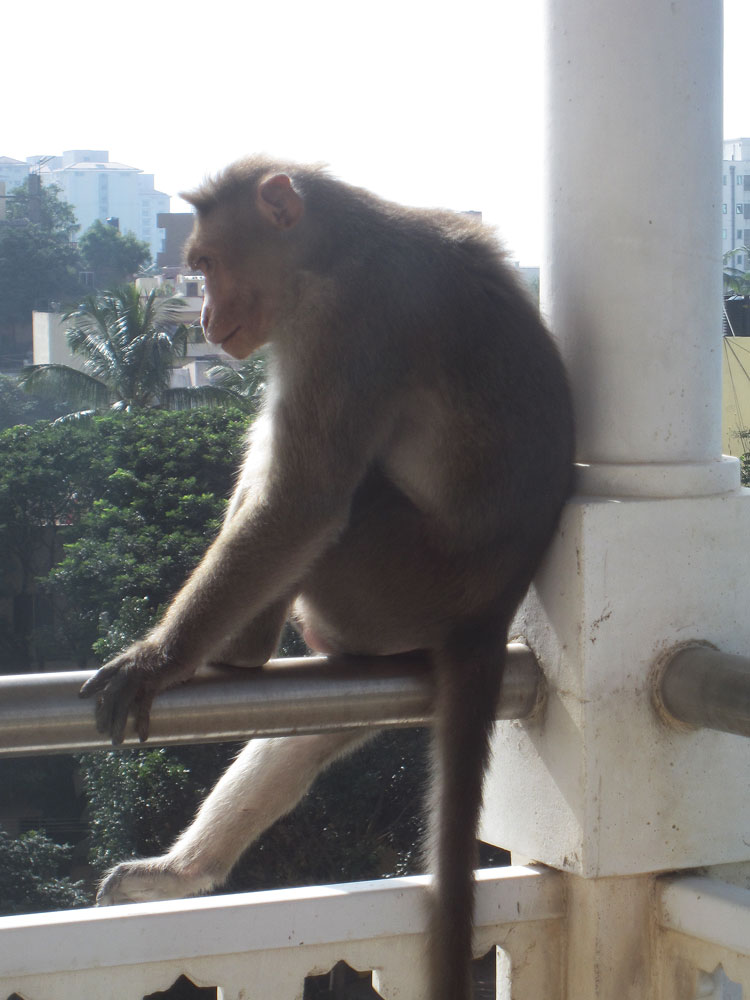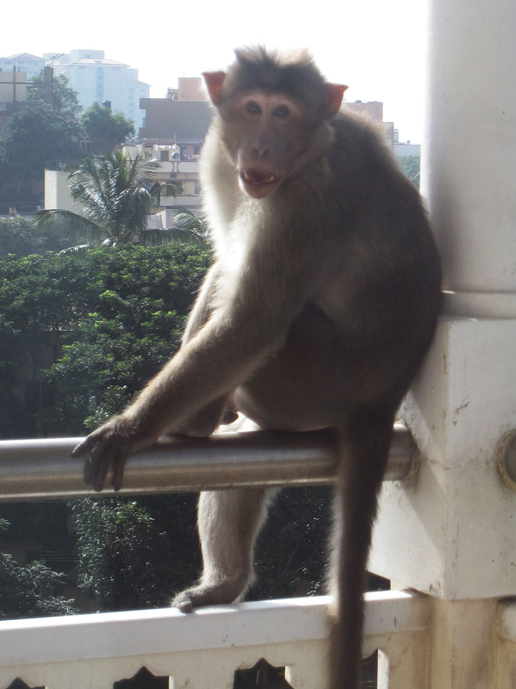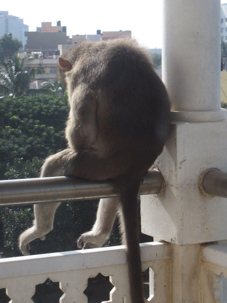 Zum Glück laust er sich nur selbst, aber dafür könnte er sich wirklich einen anderen Platz aussuchen als unseren Balkon. Von mir lässt er sich nicht verscheuchen, ich habe dummerweise auch sämtliche Schrubber draußen gelagert. Wassereimer (ohne Wasser, durchs Fenster angedroht) ignoriert er auch und fletscht nur die Zähne – oder lacht der etwa? Als es an der Tür klingelt, weil ich die Hausverwaltung um Hilfe gebeten habe, ist er natürlich plötzlich verschwunden. Die Viecher sind halt doch schlau. Der Elektriker (mit einem langen Stock bewaffnet) sieht ihn dann zwei Stockwerke unter uns auf Nachbars Balkon sitzen. Er jagt den Affen weiter… Auf dem Wohnzimmerbalkon ist die neulich schon gerupfte Palme nochmal um ein Blatt ärmer geworden. Wahrscheinlich sind die Stiele praktisch, um sich den Rücken zu kratzen!