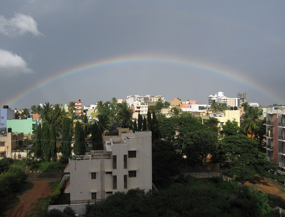 Nachmittags mal wieder eine der schöneren Seiten des Monsun: ein riesiger Regenbogen, zeitweise sogar doppelt.