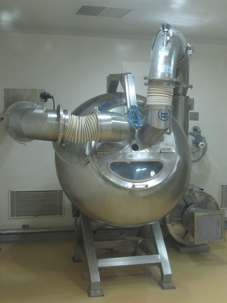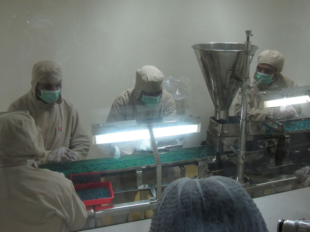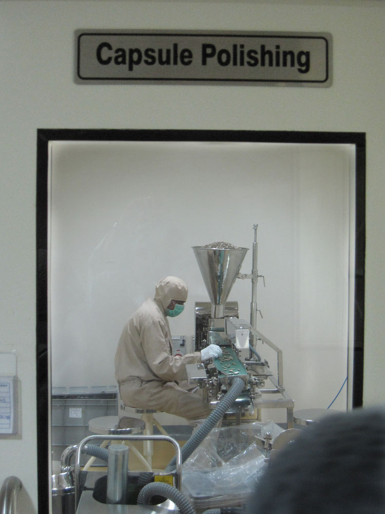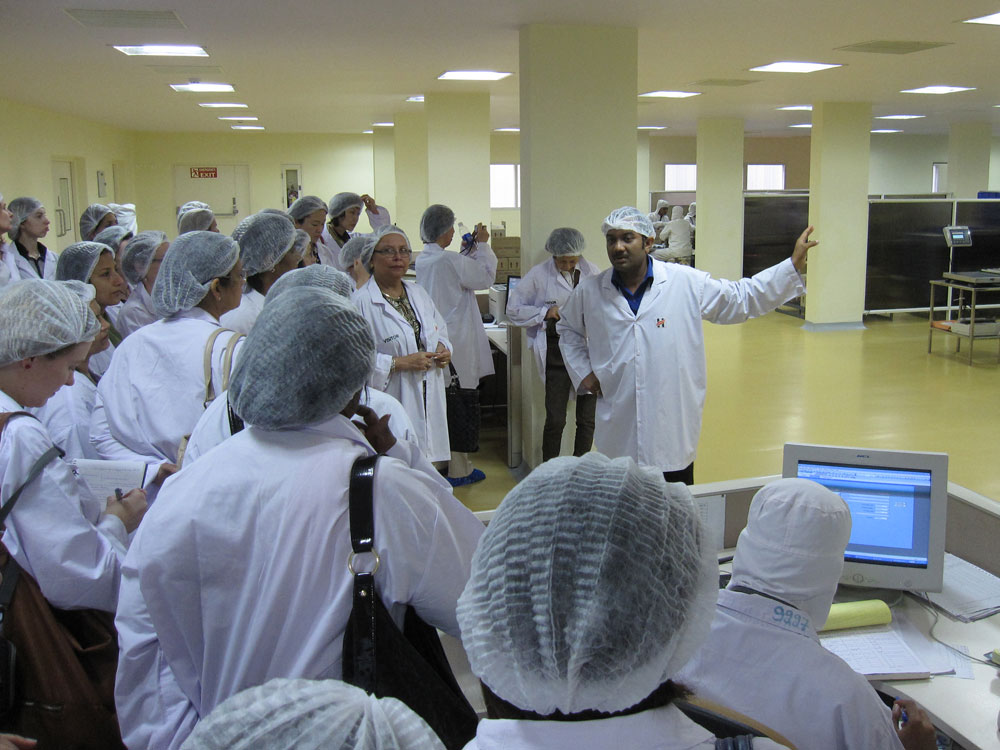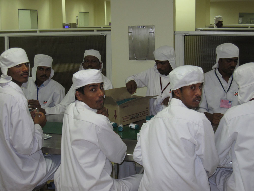 Danach sollte es eigentlich zum Essen gehen, allerdings – es schüttete in Strömen! Über den Firmenhof zu laufen kam gar nicht in Frage. Aber, kein Problem, eine halbe Stunde später (während der wir die Ärztin mit Fragen löcherten und die Restrooms bevölkerten) fuhren zwei Werksbusse vor und wir wurden ein paar hundert Meter übers Firmengelände zur Werkskantine gekarrt. Dort gab es ein leckeres indisches Mittagessen und danach besichtigten wir dann (endlich, nach einer weiteren kurzen Busfahrt) die Produktion. Wir mussten weiße Stoffkittel, Haarhauben und Folienüberschuhe anziehen. (Unsere Handtaschen hingen dann außen über den Kitteln…?) Ich hab ja leider weder von Verpackung noch von Kosmetik oder Pharmazie irgendeine Ahnung, aber alles sah sehr sauber und gut organisiert aus. (Allerdings hatten sie ja auch wochenlang vorher Zeit zum putzen gehabt…) Am auffallendsten war sicher der hohe Personaleinsatz. Statt die einzelnen Dosen maschinell in Kisten packen zu lassen, wird das hier halt von 10 Mitarbeitern von Hand gemacht. Allerdings kenne ich solche Bilder auch aus Sendung-mit-der-Maus-Geschichten.