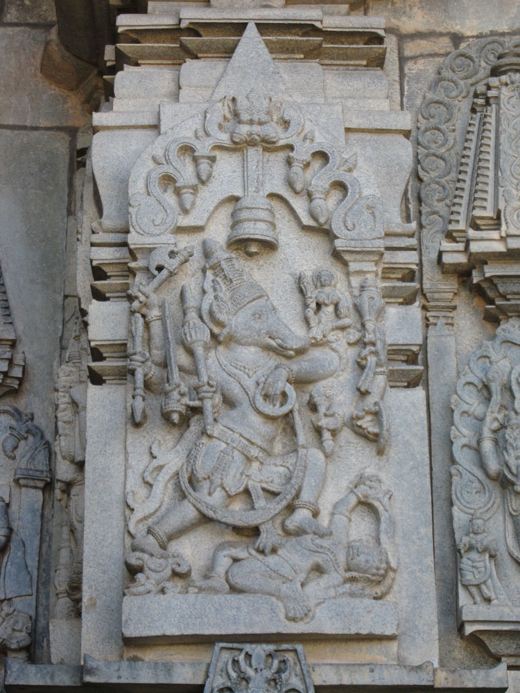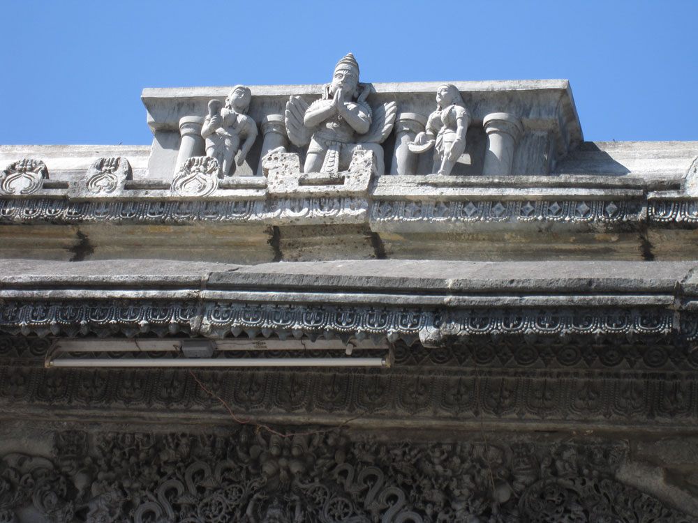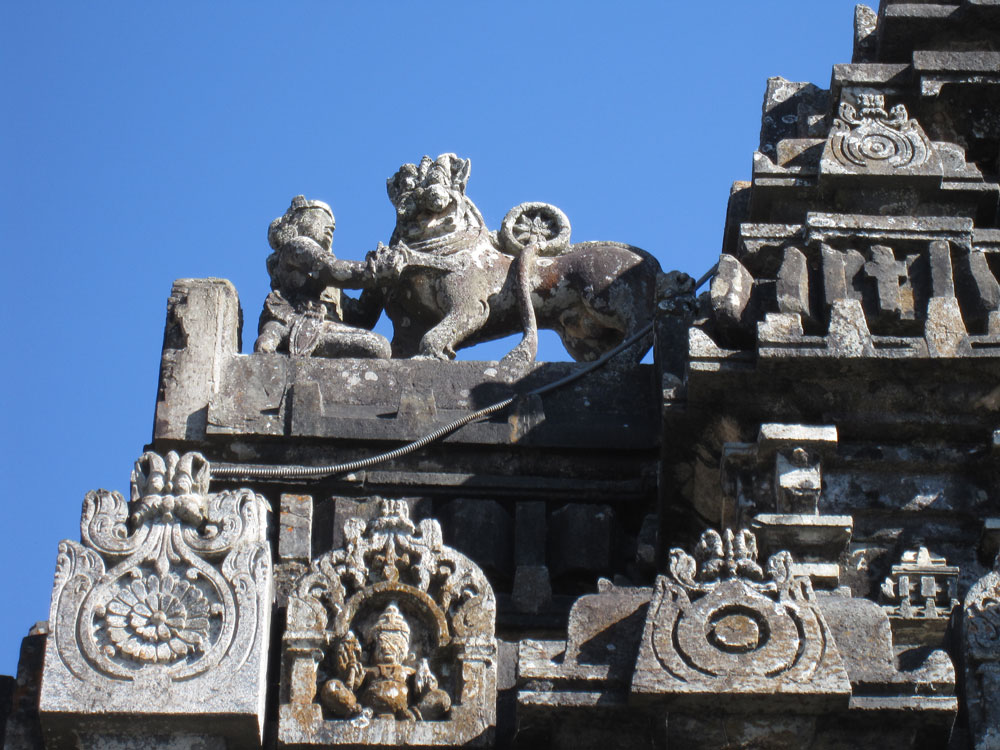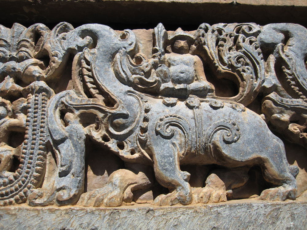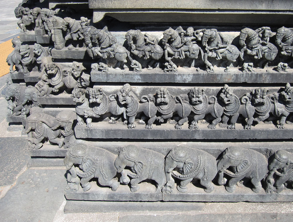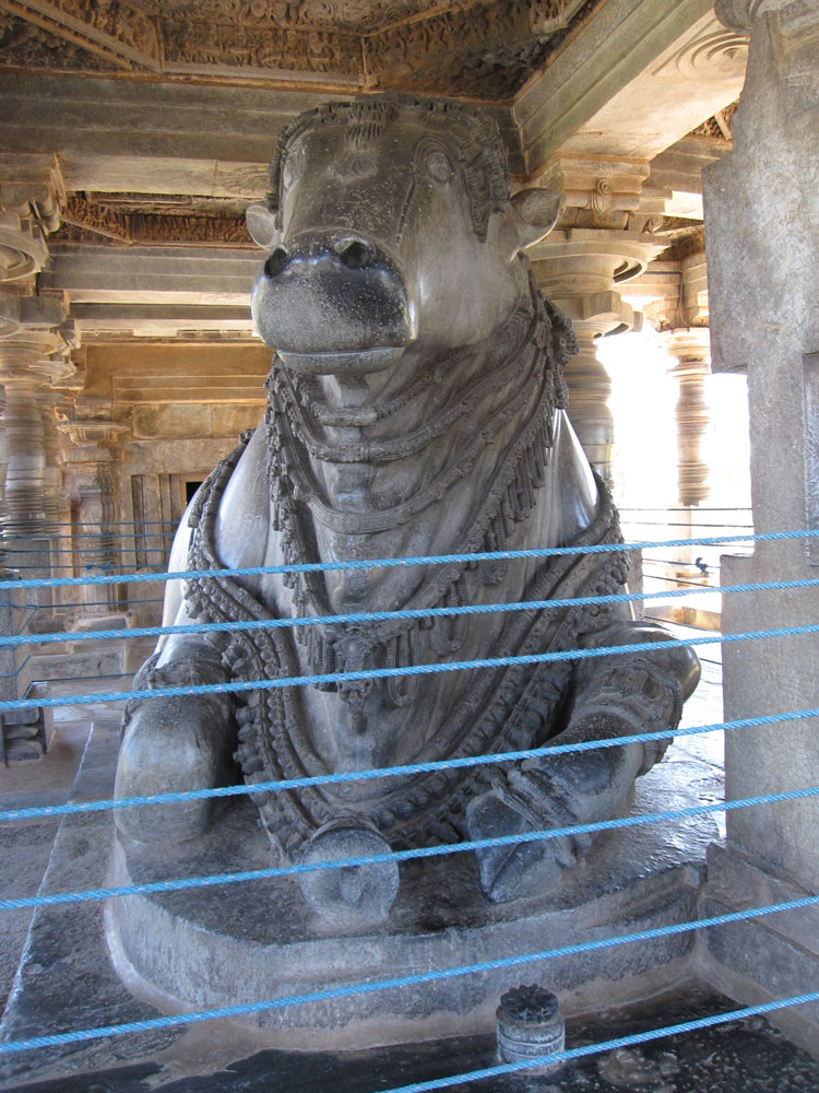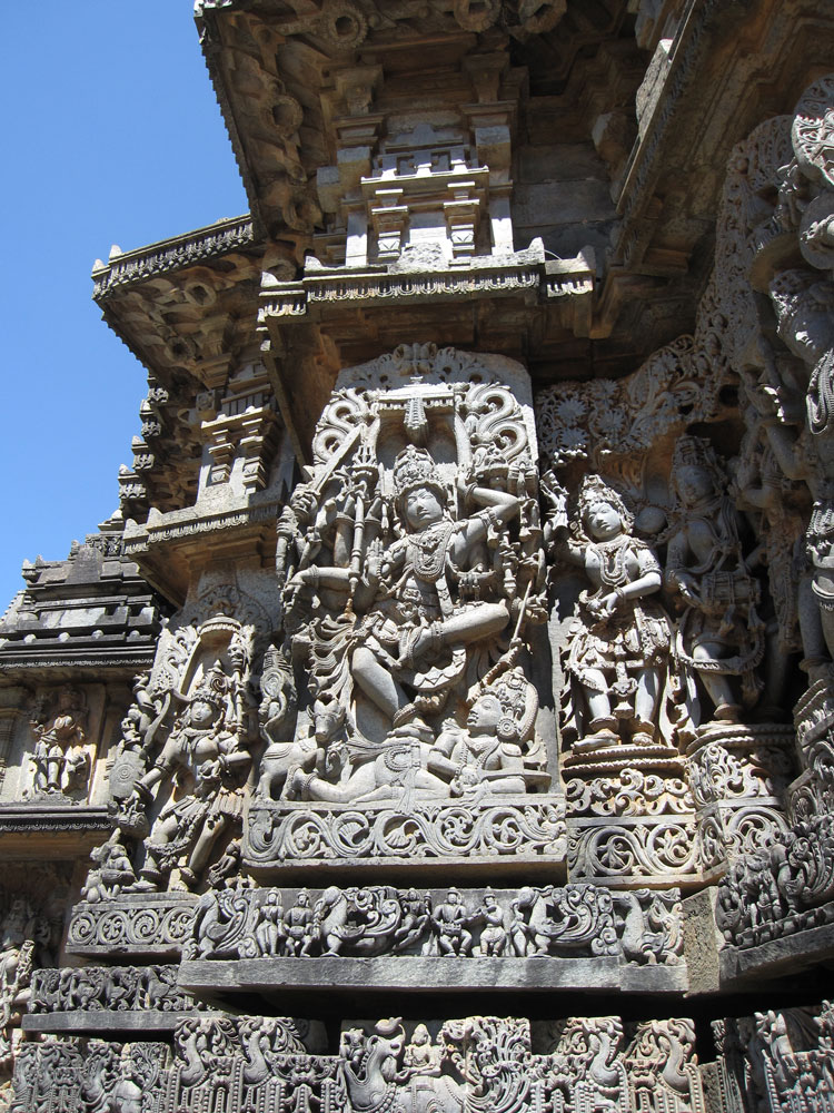Am nächsten Tag geht es zuerst nach Belur, dann nach Halebid. In dieser Reihenfolge waren diese Orte die Hauptstadt des Hoysala-Königreichs. Dementsprechend sind die Bauweise und die wahnsinnig detailreichen Steinmetzornamente sehr ähnlich. Halebid liegt allerdings viel schöner in einer großen Grünanlage mit riesigen Bäumen und Seeblick. Auf dem Rückweg essen wir in einem kleinen Resort zu mittag, das als Übernachtungsalternative in Frage gekommen wäre und noch näher an den Tempelstädten liegt. Allerdings beinhaltet der Übernachtungspreis Vollpension, was für einen reinen Besichtigungsaufenthalt ja sinnlos ist. Das Lunchbuffet ist rein indisch und extrem lecker. Einige ungewöhnliche Gerichte und alles ordentlich scharf. Die Busreisegruppe Franzosen, die kurz nach uns kommt, findet das bestimmt nicht so toll…