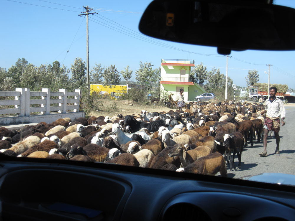 Wir hatten schon länger vor, an diesem Wochenende einen Ausflug nach Belur und Halebid zu machen, berühmten alten Tempelanlagen nicht allzu weit von Bangalore entfernt. In der nahen Kleinstadt Hassan gibt es ein ordentliches Business-Hotel, in dem wir ein Zimmer reserviert haben. Am Samstagmorgen fahren wir gemeinsam mit einer deutschen Familie, die gerade zum „Schnuppern“ hier ist, mit zwei Autos Richtung Nordwesten. Die Straße ist überraschend gut in Schuss, nur an kurzen Teilstücken wird noch gebaut und so brauchen wir weniger Zeit für die Fahrt als erwartet – eine sehr positive Überraschung! Die Sehenswürdigkeit des Tages ist eine riesige Statue in Shravanabelagola (wer’s am schnellsten ausspricht, hat gewonnen!), zu der man ziemlich viele Stufen hochlaufen muss. Gut, dass die Sonne noch nicht ganz am höchsten Punkt angekommen ist! Von oben hat man dann natürlich eine tolle Aussicht. Die Statue ist tatsächlich beeindruckend groß. Bis wir danach ein brauchbares Restaurant zum Mittagessen finden, und dann tatsächlich auch gegessen haben, wird es fast 4 Uhr nachmittags und die anderen müssen zurück, wenn sie nicht nach Einbruch der Dunkelheit noch auf der Landstraße unterwegs sein wollen. Wir fahren dann auch nur noch ins Hotel.