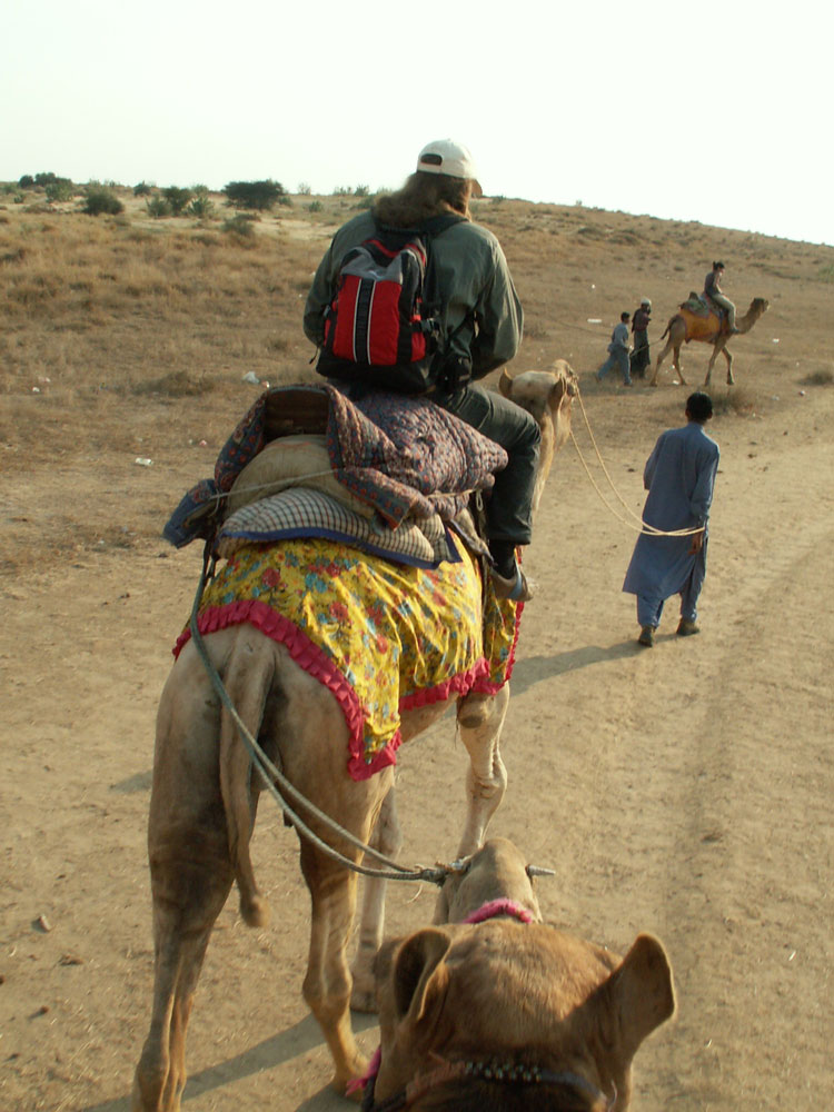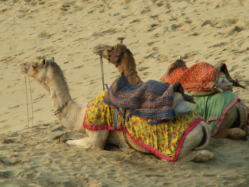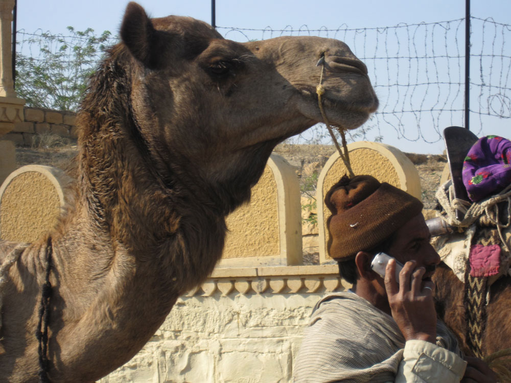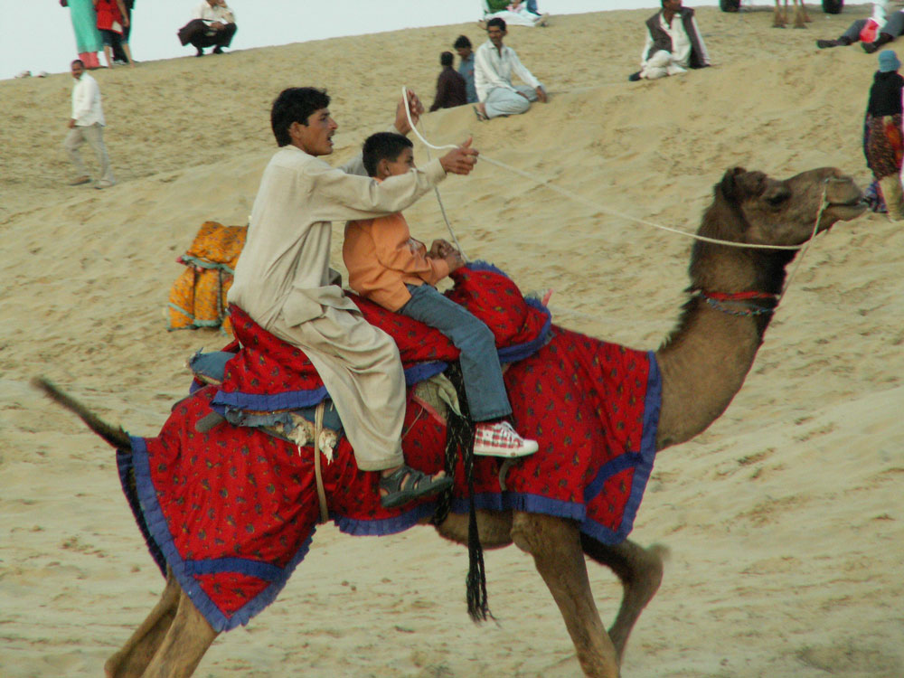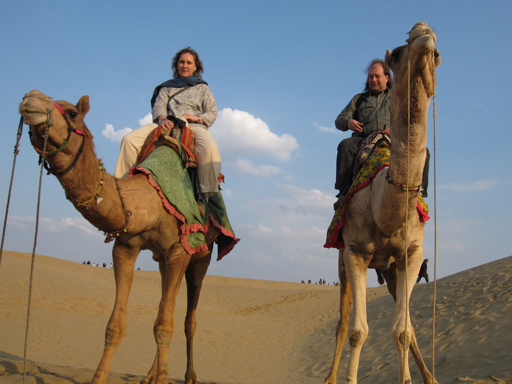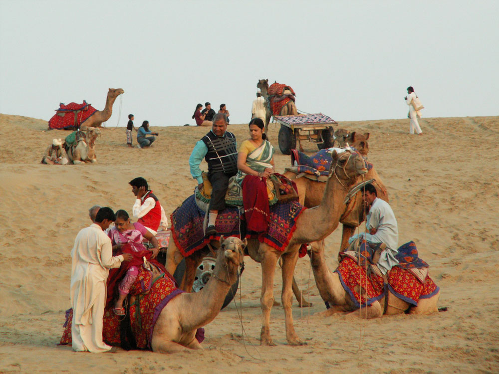 Nachmittags gehts in die Wüste, bzw. – wir sind ja mittendrin – in die Sanddünen; sonst ist das hier nämlich eher Steppe mit jeder Menge Büschen und sonstigen Pflanzen. Ungefähr eine Stunde führt uns ein Kameltreiber vom Parkplatz zu den Dünen (erwartungsgemäß mit mehrern hundert anderen Touristen aus aller Welt und Indien), aber immerhin verschafft er uns einen Platz in der ersten Reihe mit freiem Blick auf den erhofften Sonnenuntergang. Vorher müssen wir uns noch gegen singende Zigeunergruppen, aufdringliche Getränkeverkäufer , schreckliche Flötenspieler und sonstige Touristen-Nepper wehren, aber da die meisten Touristen in dieser Gegend direkt aus dem Flieger fallen, ohne vorher irgendeine Ahnung von Indien zu haben, ist das nicht weiter verwunderlich…