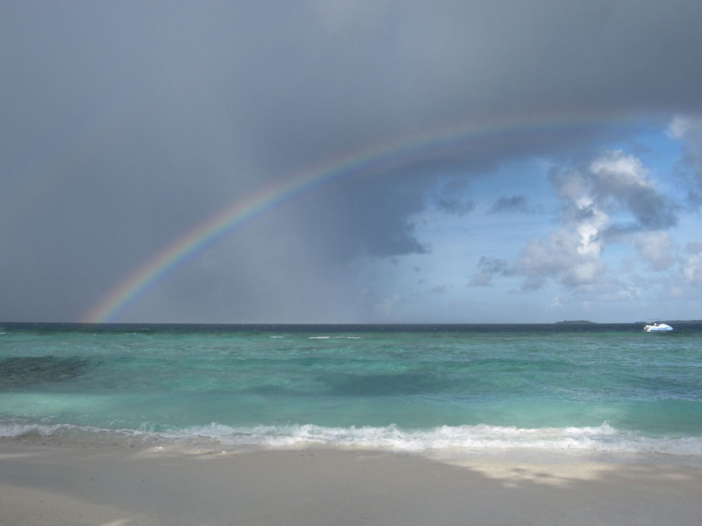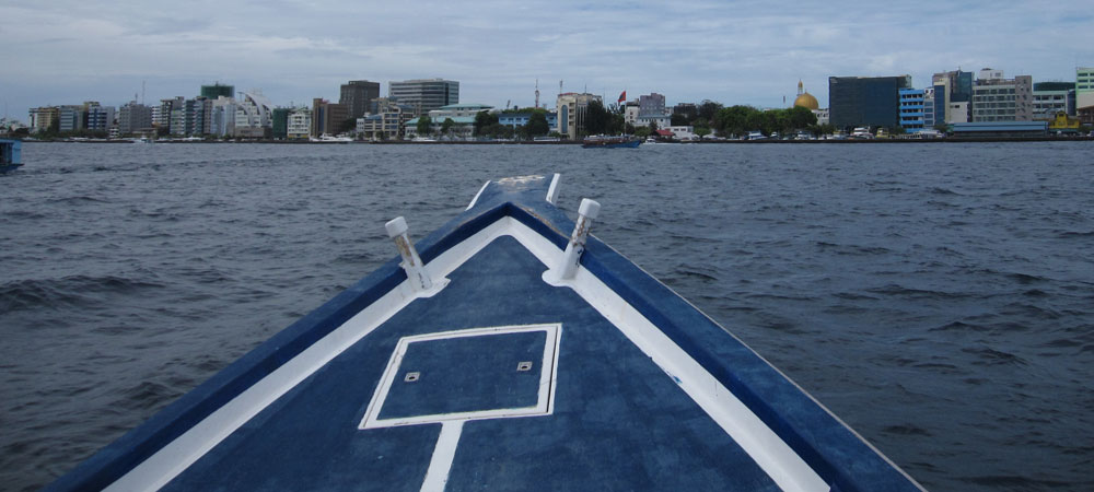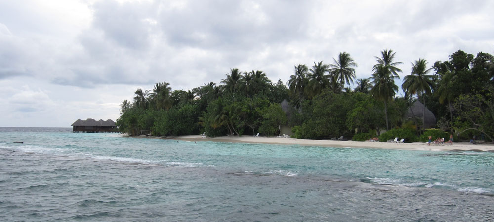 Über Ostern haben wir uns noch eine Traum erfüllt und endlich den kurzen Flug auf die Malediven für ein langes Wochenende gebucht. Ankunft (pünktlich trotz AirIndia!!) im strömenden Regen, aber der richtige Fähren-Schalter ist schnell gefunden und innerhalb einer Viertelstunde sind auch die beiden anderen Familien eingetroffen, die mit uns zum Resort fahren. Irgendwo finden sich auch noch Regenschirme für die wenigen Meter zum Boot – das meiste Wasser spritzt eh von unten hoch und es ist so schwül, dass die Feuchtigkeit von oben in Tropfenform nicht weiter ins Gewicht fällt. Während der Überfahrt lässt der Regen dann nach und wir haben eine ganz gute Sicht auf die anderen Inseln und den Flughafen.