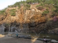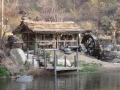 Der Hongje (mehr Bach als Fluss) verläuft unter einer Schnellstraße und an beiden Uferseiten wurden breite Fußwege angelegt. Immer wieder findet man auch kleine Ansammlungen von Freiluft-Fitnessgeräten, wie überall hier in Korea. Im Sommer muss es hier angenehm schattig sein, jetzt laufen wir aber lieber auf der Sonnenseite. Die Wasserfontänen sind abends beleuchtet, erzählen uns die beiden. Schließlich überqueren wir den Wasserlauf an einer kleinen wassergetriebenen Getreidemühle. Man sieht sogar noch, wie sie früher funktioniert hat: Das Wasserrad trieb keinen sich drehenden Mahlstein an, sondern eine Art großen Mörser, der die Körner in einer großen Steinschale wie ein Hammer zerkleinert.