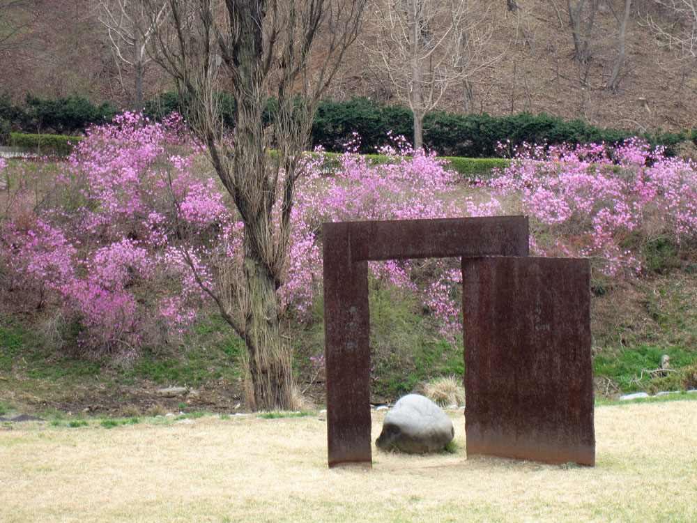 Der nächste Stopp ist ein Museum für zeitgenössische Kunst etwas außerhalb von Seoul. Im Museum selbst ist gerade nicht viel zu sehen, aber wir sind ja vorwiegend wegen des Parks hier. Baumblüte ist da gerade nicht, aber schöne Azaleen im Skulpturengarten, und einfach schöne Natur.