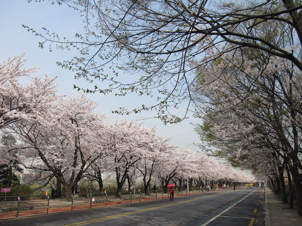 Der vierte Stopp liegt wieder in Seoul, an zwei kleinen künstlichen Seen. Der westliche See ist ganz von Kirschbäumen umgeben, die gerade in voller Blüte stehen. Hier ist jetzt am frühen Nachmittag schon die halbe Stadt unterwegs, dazwischen viele Jogger und Walker beim täglichen Workout – Besucherströme hin oder her! Es wird viel fotografiert und die Stimmung ist sehr nett, alle freuen sich über das sonnige Frühlingswetter mit den tollen Blüten überall.