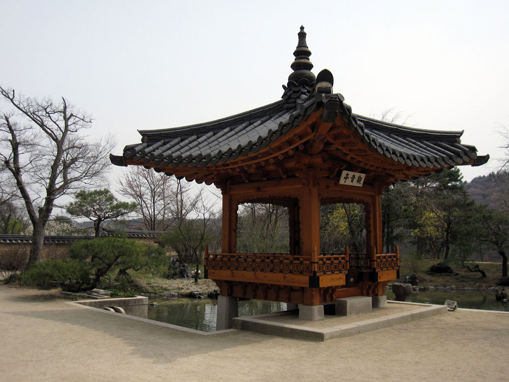 Der Hongje (mehr Bach als Fluss) verläuft unter einer Schnellstraße und an beiden Uferseiten wurden breite Fußwege angelegt. Immer wieder findet man auch kleine Ansammlungen von Freiluft-Fitnessgeräten, wie überall hier in Korea. Im Sommer muss es hier angenehm schattig sein, jetzt laufen wir aber lieber auf der Sonnenseite. Die Wasserfontänen sind abends beleuchtet, erzählen uns die beiden. Schließlich überqueren wir den Wasserlauf an einer kleinen wassergetriebenen Getreidemühle. Man sieht sogar noch, wie sie früher funktioniert hat: Das Wasserrad trieb keinen sich drehenden Mahlstein an, sondern eine Art großen Mörser, der die Körner in einer großen Steinschale wie ein Hammer zerkleinert.