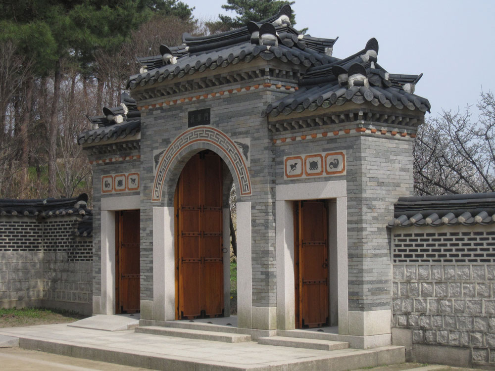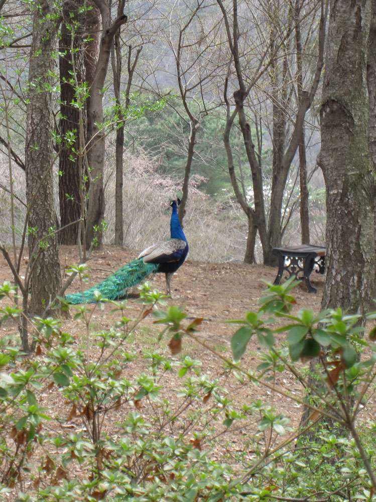 Danach fahren wir etwas länger als eine Stunde weiter raus auf’s Land. Auch dort gibt es wieder ein Museum, diesmal eine Sammlung koreanischer Kunst, die sich die meisten von uns aber gar nicht ansehen, schließlich interessieren wir uns für die Baumblüte! Hier blühen die Kirschen noch nicht, dafür zwei Sorten Aprikosen, Narzissen, Clematis, Schneeglöckchen, … und die ganze Anlage ist sehr schön gestaltet. Zwischen den Bäumen läuft ein riesiger Pfau frei herum! Zwischen den Obstbäumen stehen überall „Beoksu"-Statuenpaare aus Stein. Diese heißen u.a. auch Jangseung, unter diesem Namen kann man mehr über sie bei Wikipedia nachlesen (leider bisher nur auf englisch). http://en.wikipedia.org/wiki/Jangseung