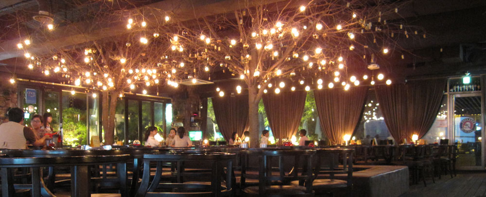 Anschließend überqueren wir den kleinen Hügel „Ansan" und fahren von dort aus mit der U-Bahn in das Stadtviertel, in dem wir vergangenen August im Hotel waren. Dort kennen wir noch einige gute Restaurants. Ausnahmsweise gibt es heute Mexikanisch, und dazu ein leckeres Erdinger Hefeweizen! Und da draußen lange Schlangen auf einen Tisch zum Essen warten, ziehen wir um in ein europäisch aufgemachtes Lokal namens „Mürren", wo man in Ruhe einfach noch sitzen und was trinken kann. Die Deko dort ist sehr nett: man sitzt drinnen, aber unter einem großen Baum, geschmückt mit Lichterketten!