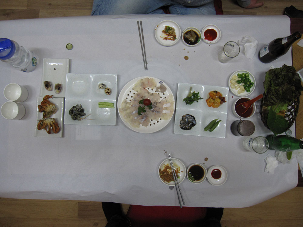 Außerdem gibt es rund um die Insel natürlich jede Menge Meer und kleine Fischerhäfen. Zu essen gibt es demnach viel rohen Fisch (wie japanisches Sashimi, lecker) und alle möglichen sonstigen Meeresfrüchte – auch roh! Nicht unser Geschmack. Einfach zu glibberig. Wir vergessen dummerweise meistens, die Speisen VOR dem Essen zu fotografieren!
