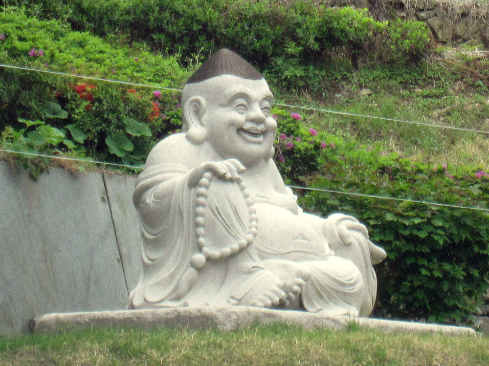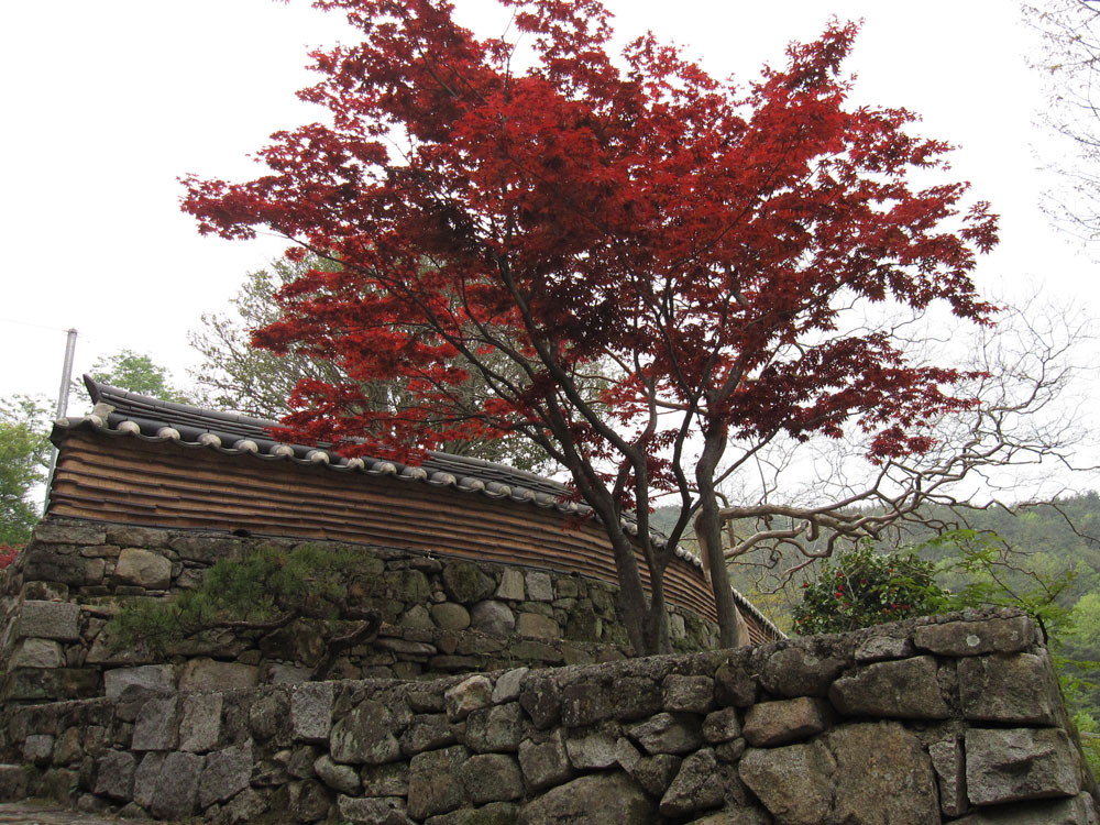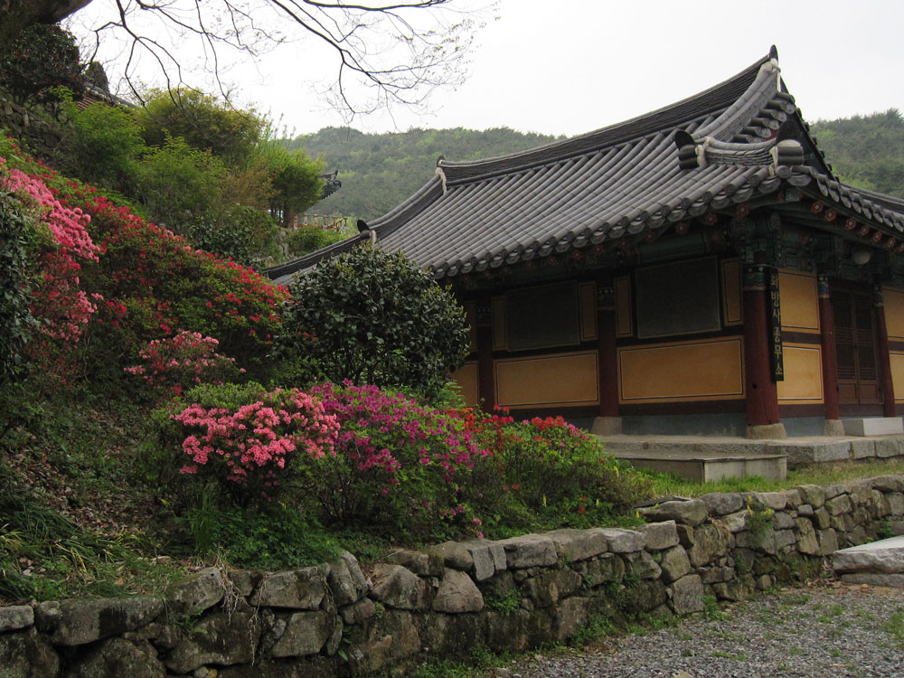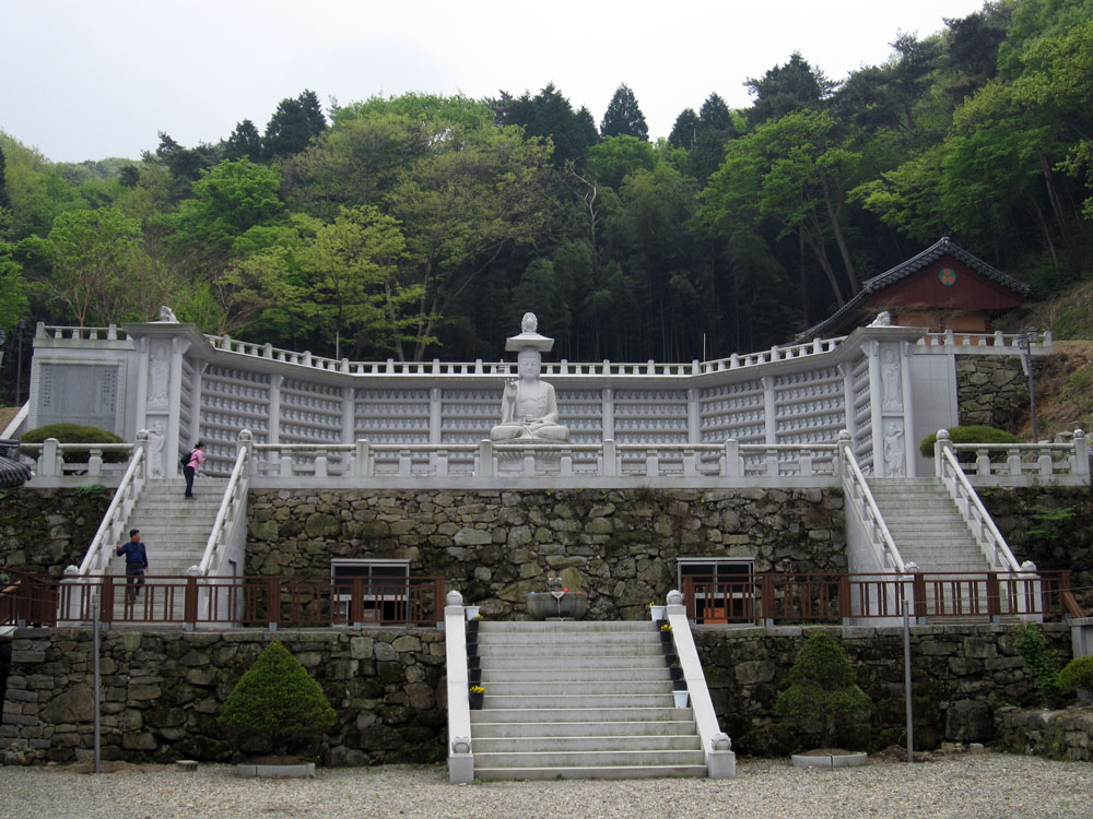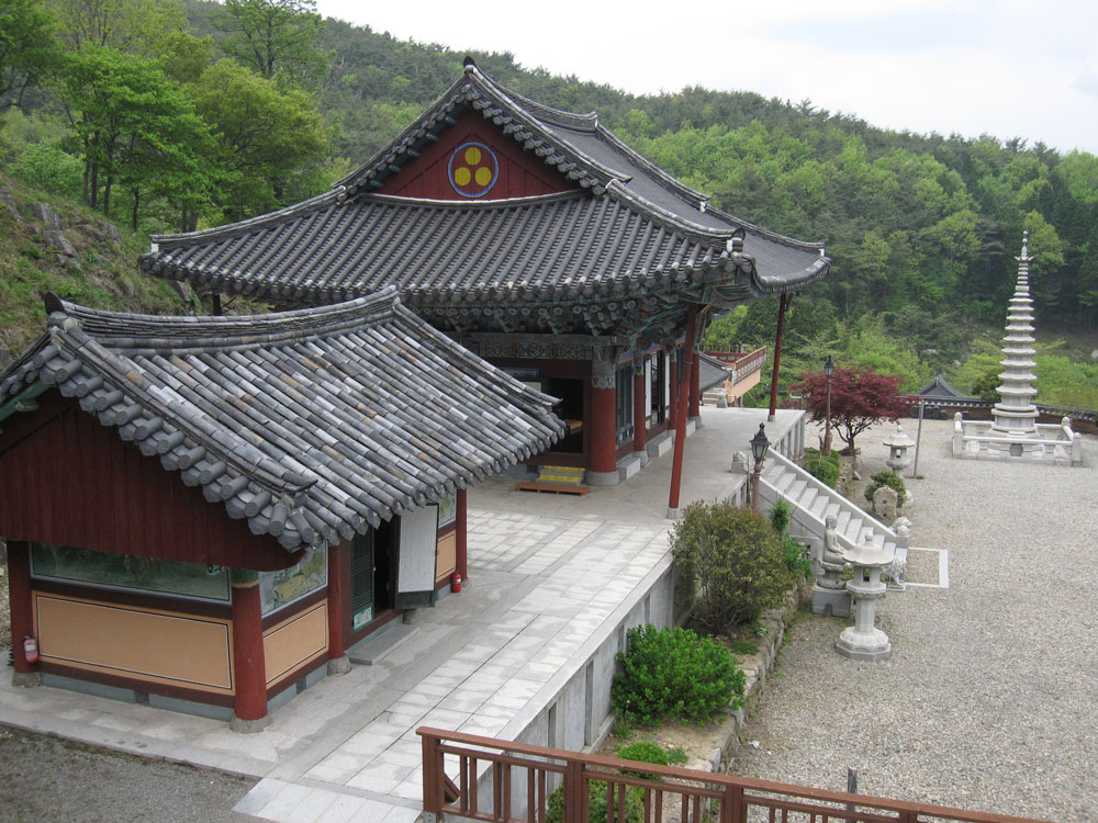 Unterwegs auf der Insel sind wir noch zu einem der zahlreichen Tempel gefahren, ganz am Ende eines idyllischen Tals – vorbei an einem Windradmuseum (leider „under renovation“), einem Stausee und einem Schmetterlingshaus (leider geschlossen). Man musste noch ein Stück den steilen Berg hochlaufen, aber es ging durch einen wunderschönen Wald, und die steileren Wege sind in Korea immer mit Stufen ausgestattet. Die Tempelgebäude stammen aus dem 17. Jahrhundert.