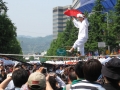 Ungefähr die halbe Stadtmauer laufen wir ab, dann wird’s uns zu heiß in der Sonne und wir gehen runter zum Palast. Dort treten Akrobaten und Musiker auf, die Besichtigung sparen wir uns deshalb für den nächsten Besuch hier auf. Auf dem Marktplatz ist eine „Koreanische Produkte“-Messe: lauter Probierstände und viele Infos über Lebensmittel, Nahrungsergänzungsmittel, Tourismus… und sogar ein Stand des Anyang-Public-Art-Project (APAP) mit Bildbänden und Infos zu diesen in ganz Anyang verteilten Kunstwerken. Zur Erinnerung: wir wohnen in Anyang! Und haben auch einige der Skulpturen schon gesehen, ohne allerdings den Zusammenhang zu kennen. 3 Projekte gab es schon 2005, 2007 und 2010. 2013 soll das nächste stattfinden, wir sind gespannt.