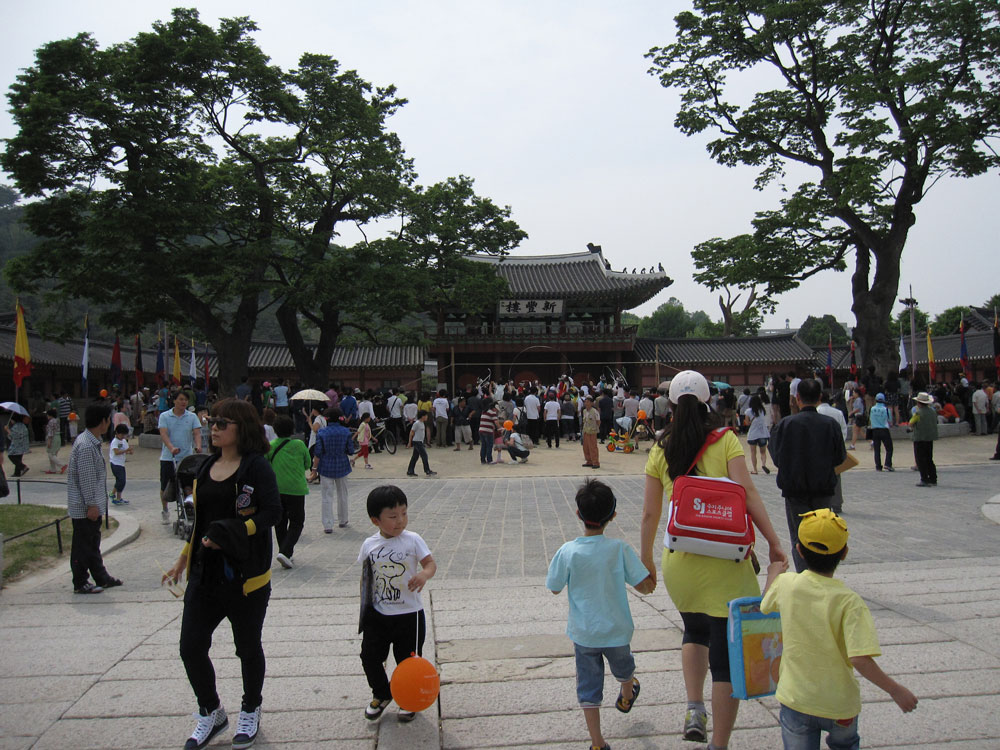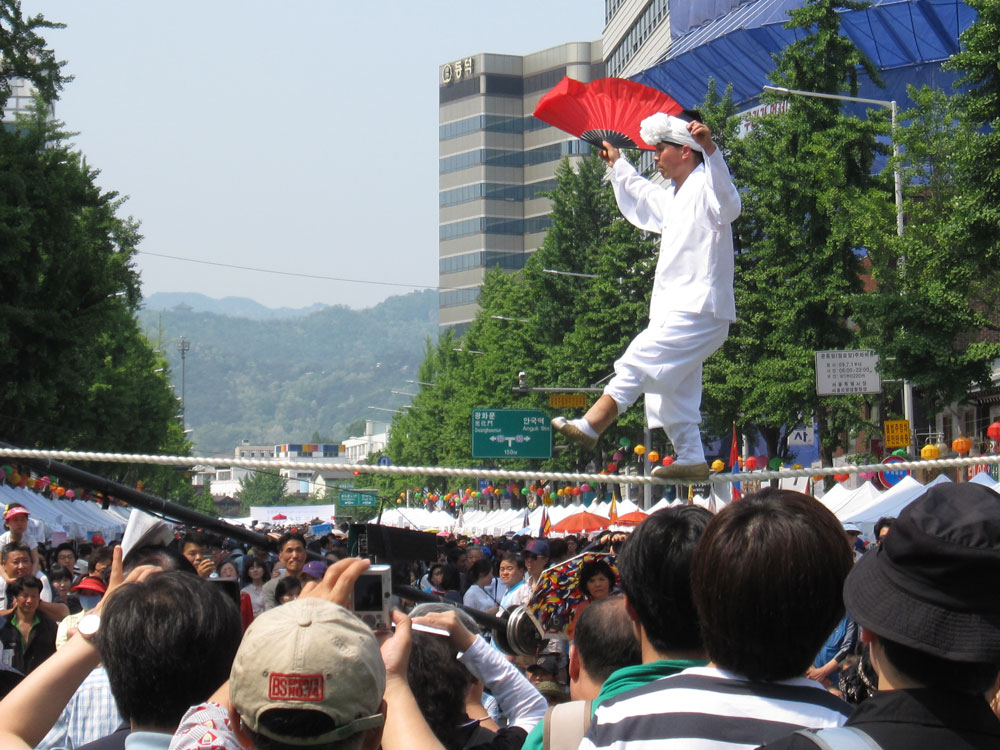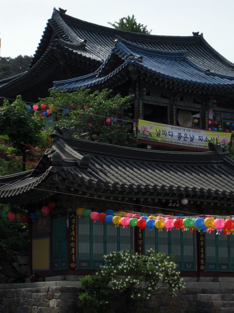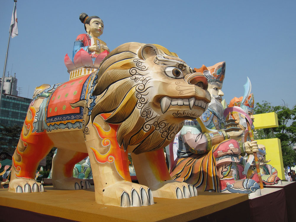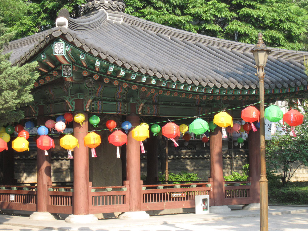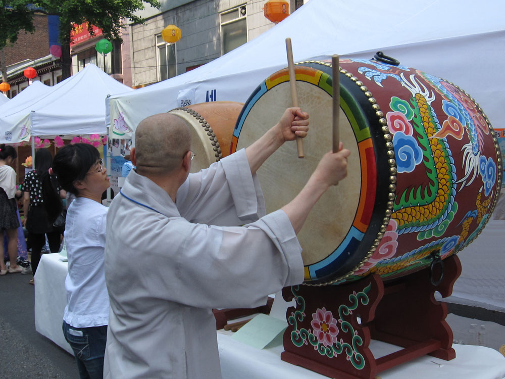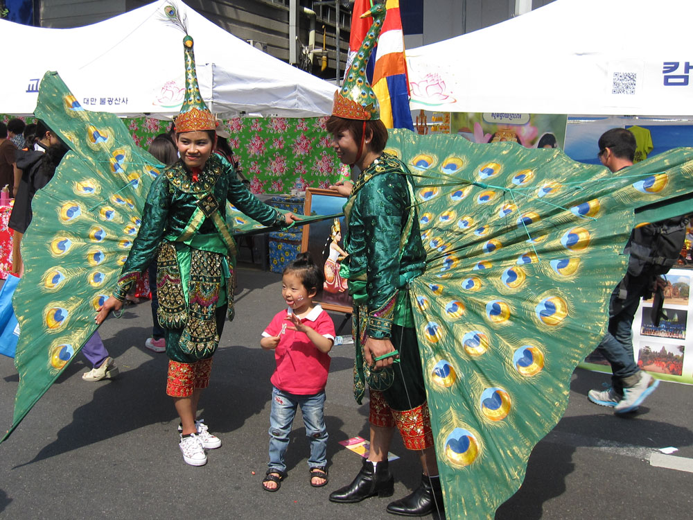 Lotuslaternenfest in Seoul, zu Ehren von Buddhas Geburtstag, dem höchsten buddhistischen Feiertag! Vor einem der wichtigsten Tempel in Seoul ist die Hauptstraße heute Fußgängerzone und voller Stände von buddhistischen Organisationen aus ganz Asien. Viele informieren über die spezifische Glaubensrichtung in ihrem Land, oft kann man irgendetwas mitmachen (Sari wickeln bei den Indern ;-) oder etwas basteln. Andere verkaufen Kunsthandwerk oder Nahrhaftes. So kommen wir am Stand von Sri Lanka zu einem leckeren Mittagessen, ergänzt durch ein paar weitere Leckereien an anderen Ständen.