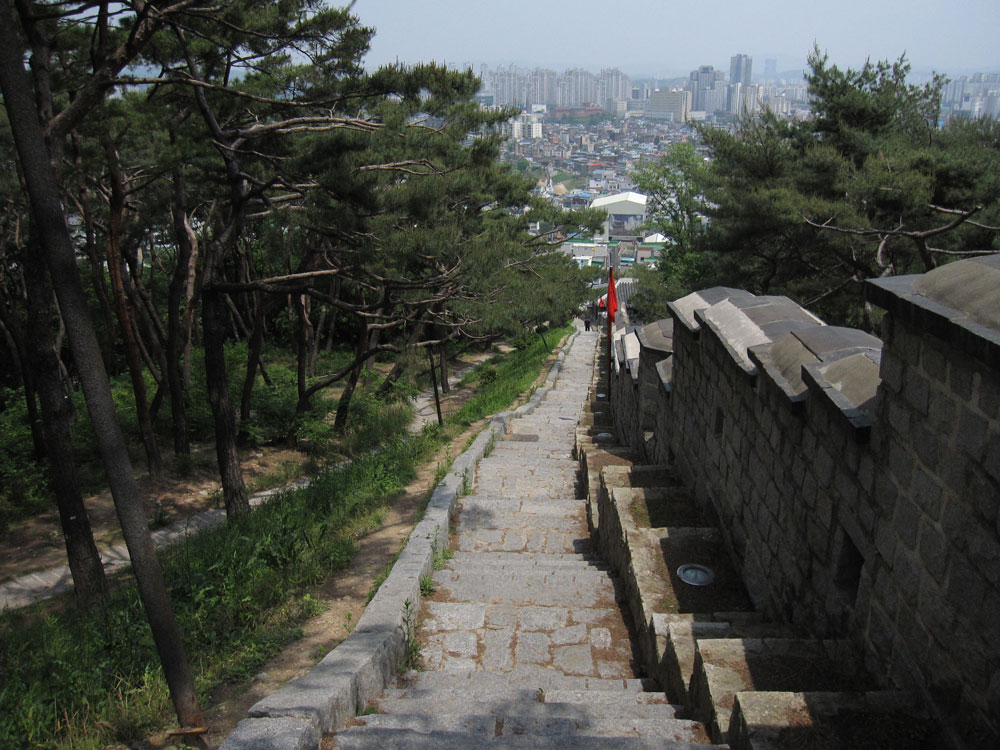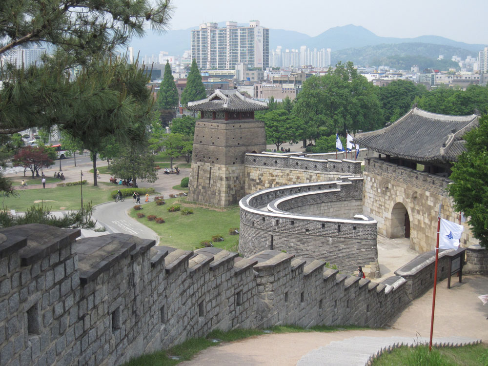 Wir fahren in die nur 20km entfernte Stadt Suwon, um die dortige berühmte Festung anzuschauen. Zuerst muss man die Festungsmauer mal erklimmen, wird oben aber durch eine tolle Aussicht und schöne ruhige Atmosphäre belohnt. Fast niemand unterwegs heute, kaum zu glauben, dabei ist doch Wochenende!