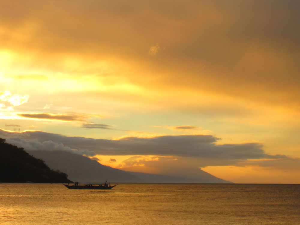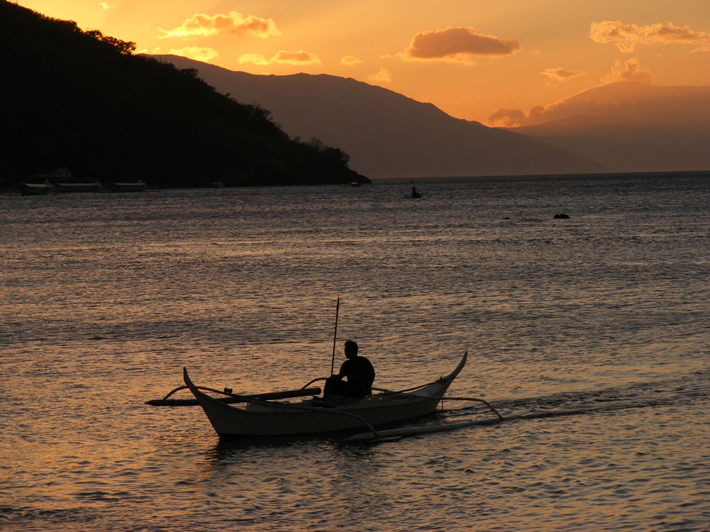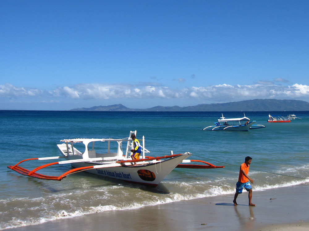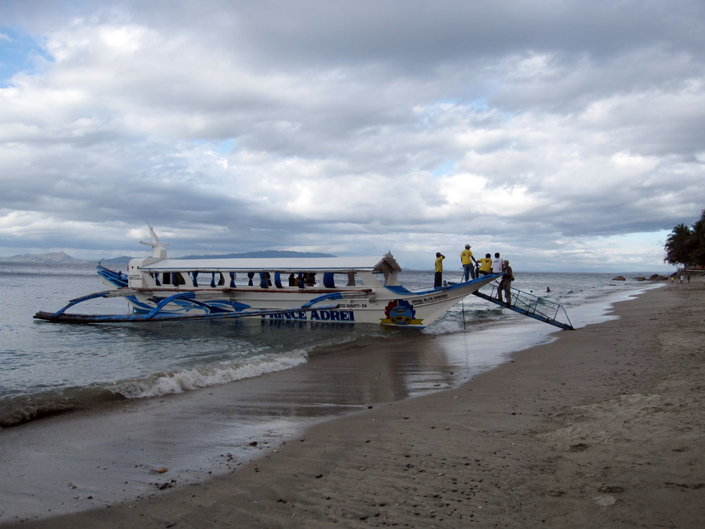 Vom Flughafen in Manila wurden wir mit einem klimatisierten Toyota Innova zum ca. 2 Std. südlich gelegenen Fährhafen gebracht und von dort fuhren wir mit 30 anderen (davon 2/3 Koreaner!) noch eine Stunde in einem motorisierten „Bangka“-Holzboot direkt zum Hotelstrand in Puerto Galera.
