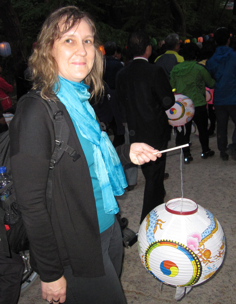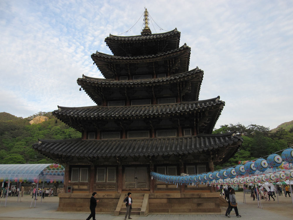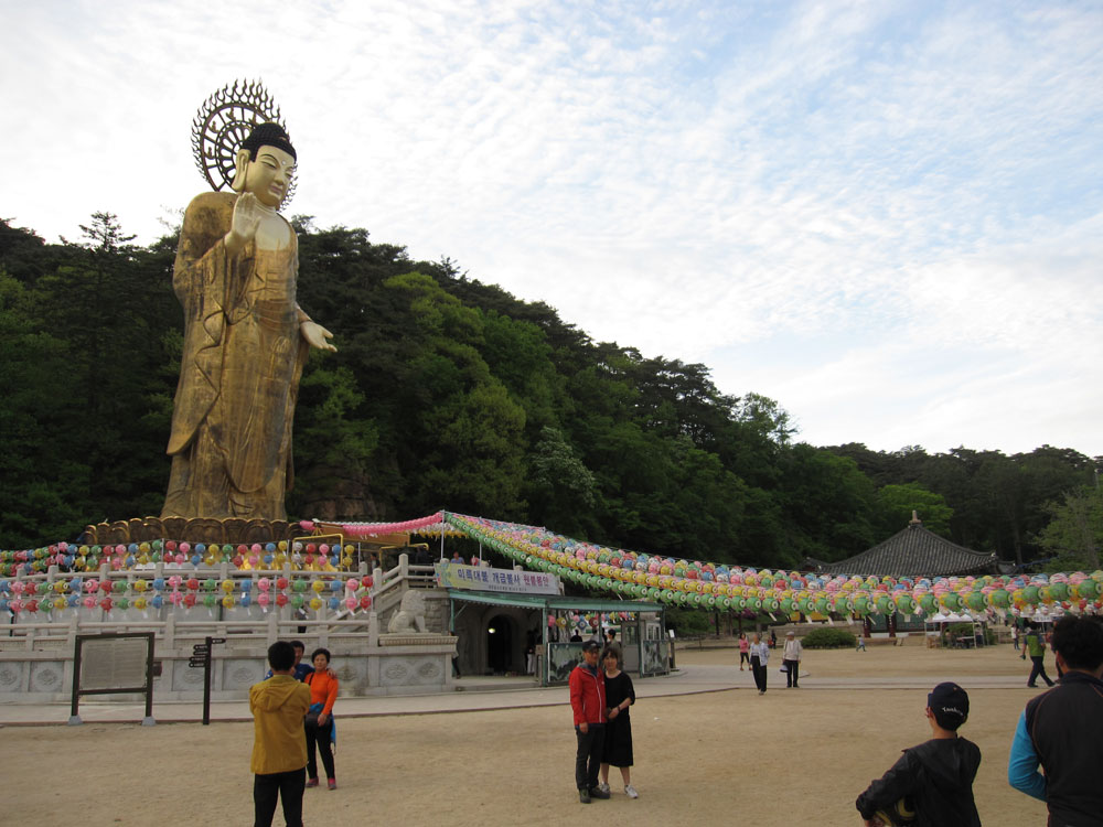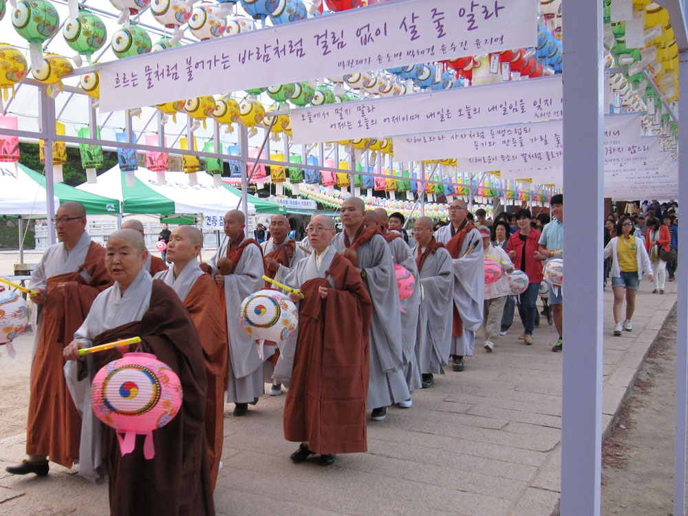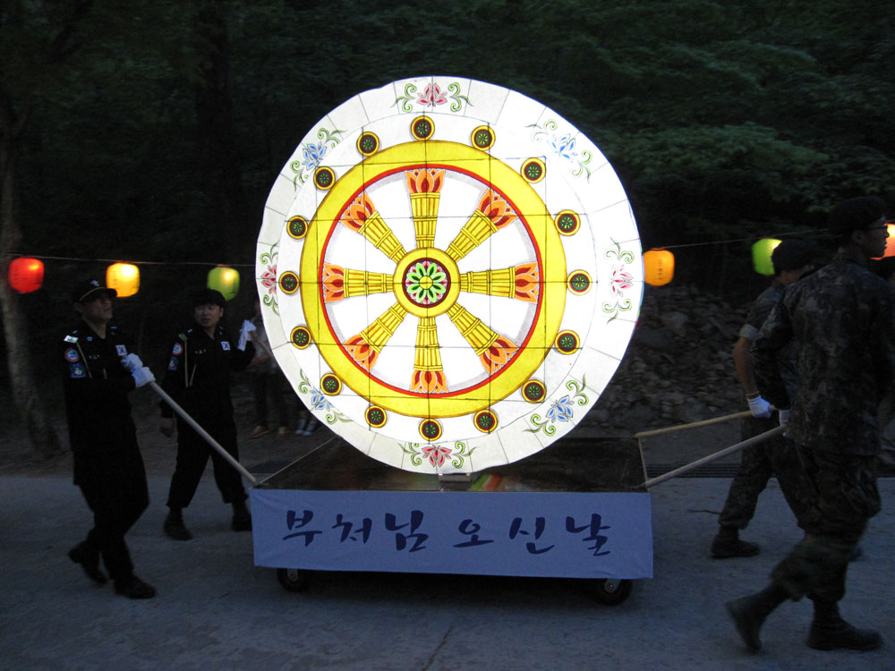 Am Geburtstag des Buddhas Gautham sind wir ganz zufällig bei einer völlig ungeplanten Tempelbesichtigung mitten im Laternenumzug gelandet, der die Feierlichkeiten abschließt. Kurz vor Einbruch der Dunkelheit trafen sich im Beopjusa-Tempel am Songnisan-Berg (법주사, 속리산) Mönche, Würdenträger und fromme Bürger. Begleitet von lauter traditioneller Musik und Mantras aus dem Lautsprecher trugen hier stationierte Soldaten die koreanische Flagge vorneweg. Dahinter schoben Polizisten eine große pagodenförmige Laterne und mehrere in Trommelform. Dann folgten die Mönche und Nonnen und schließlich das gemeine Volk, alle mit den traditionellen ballonförmigen Laternen.