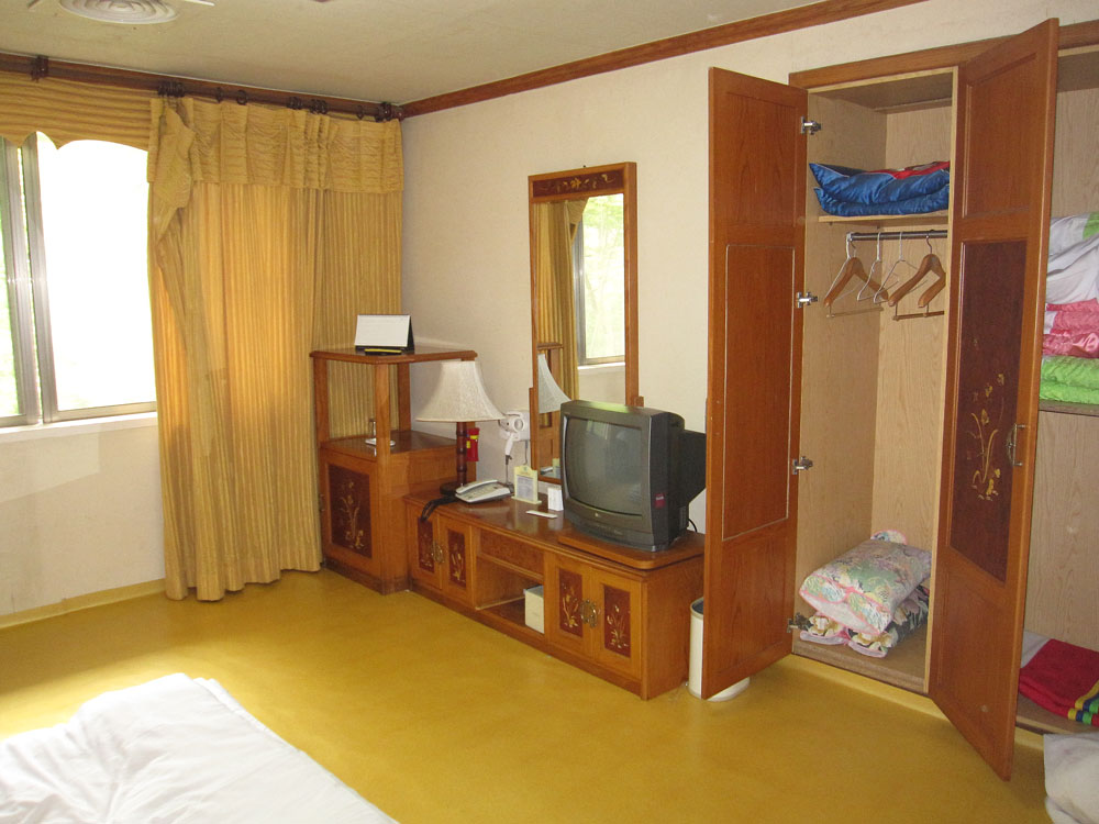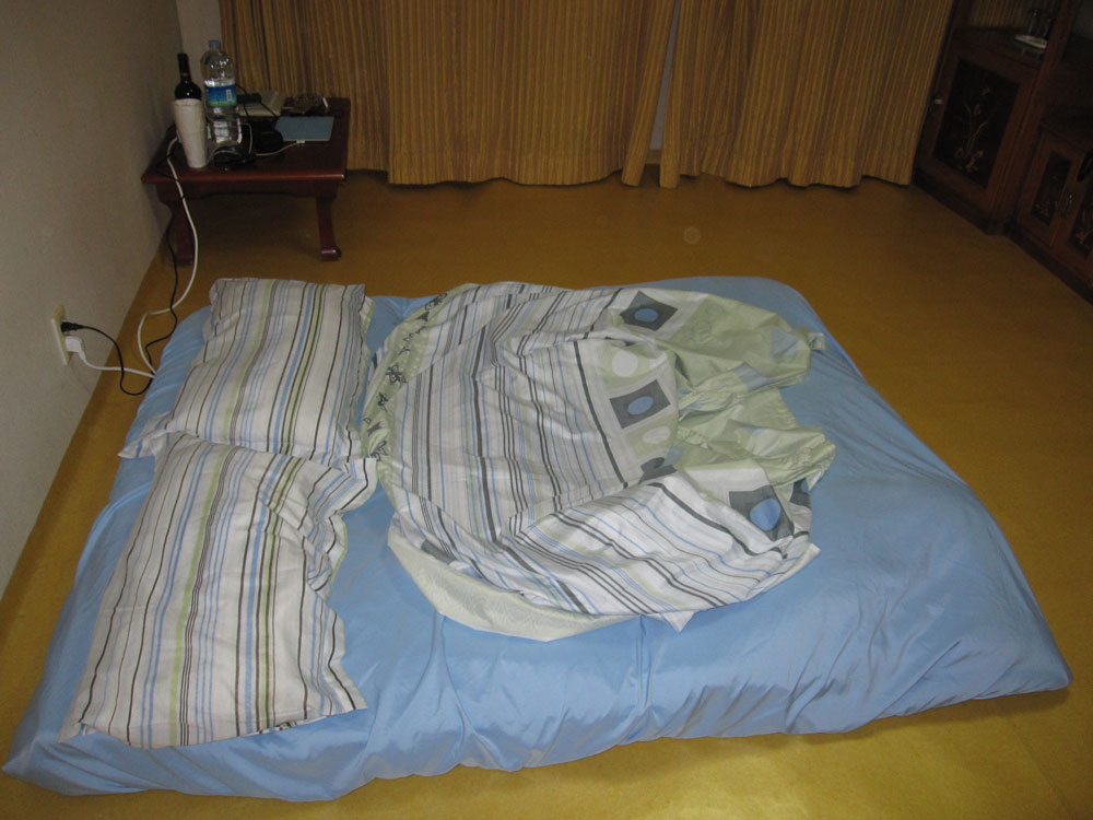 Bei einem spontanen Ausflug zu einem Bergtempel haben wir (mangels Zimmer mit Bett) endlich zum ersten Mal auf dem Fußboden schlafend übernachtet. Das hört sich schlimmer an, als es ist! Statt Bett oder Matratze wird eine Art dicke Decke auf dem gemütlich beheizten Boden ausgelegt. Da so ein Zimmer normalerweise für bis zu vier Personen gedacht ist, haben wir einfach alle verfügbaren Decken und dazu noch die Bettdecken übereinander gelegt. Das war sogar bequemer als manche koreanische Hotelbetten. Leider kann man in solchen „Ondol“-Zimmern (Ondol ist die koreanische Bezeichnung für diese Fußbodenheizung) oft im Zimmer die Heizung nicht regeln, nicht mal komplett ausschalten. Und dann ist es meistens sehr, sehr warm…