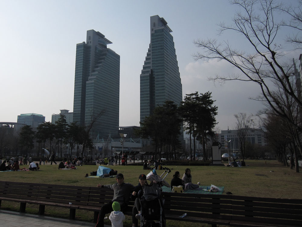 Marcus hat frei, in Korea wird gewählt und da das Wetter schön und auch überraschend warm ist, hält sich alles draußen auf. Wir erforschen also endlich mal die Gegend südlich unserer Wohnung zu Fuß. Da soll es auch eine Straße mit diversen Restaurants geben, wo man gut Koreanisch isst (sagen Marcus‘ Kollegen). Auf dem Weg dorthin kommen wir durch „unseren" Stadtpark, wo Marcus öfter mal nach dem Mittagessen eine Runde mit den Kollegen dreht. Heute ist natürlich alles voller Familien mit Kindern: Drachen steigen lassen, Fahrrad/Rollschuh/Roller fahren, Ballspielen und picknicken, selbst hier mitten in der Stadt. Die Restaurants finden wir später auch noch, bisher haben wir aber noch keins ausprobiert…